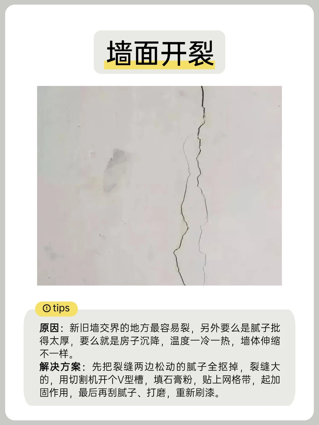 🔎原因:房屋沉降、材料配比不当、温度变化等。 预防:选用合格建材,按说明施工。
