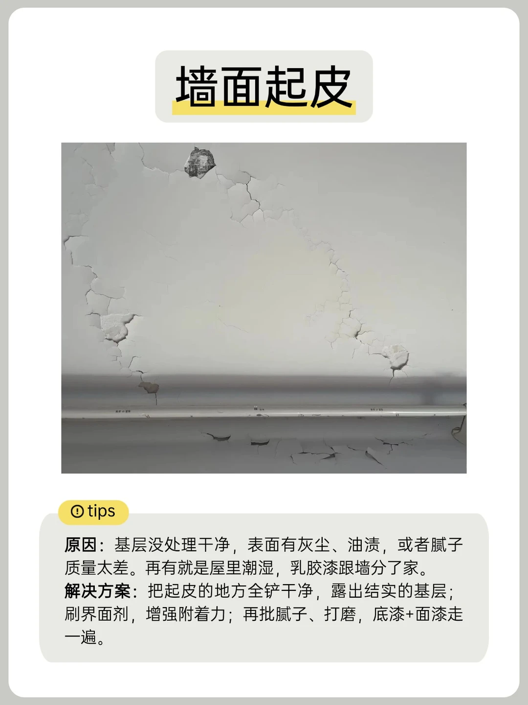 ⭐️解决方案:把起皮的地方全铲干净,露出结实的基层;刷界面剂,增强附着力;再批腻子、打磨,底漆+面漆走一遍。