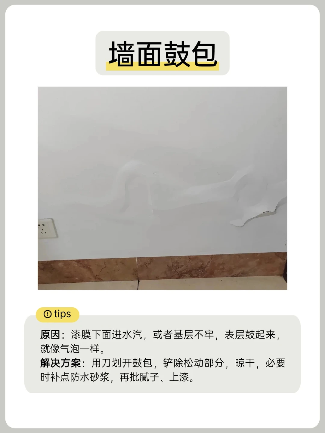 ⭐️解决方案:用刀划开鼓包,铲除松动部分,晾干,必要时补点防水砂浆,再批腻子、上漆。