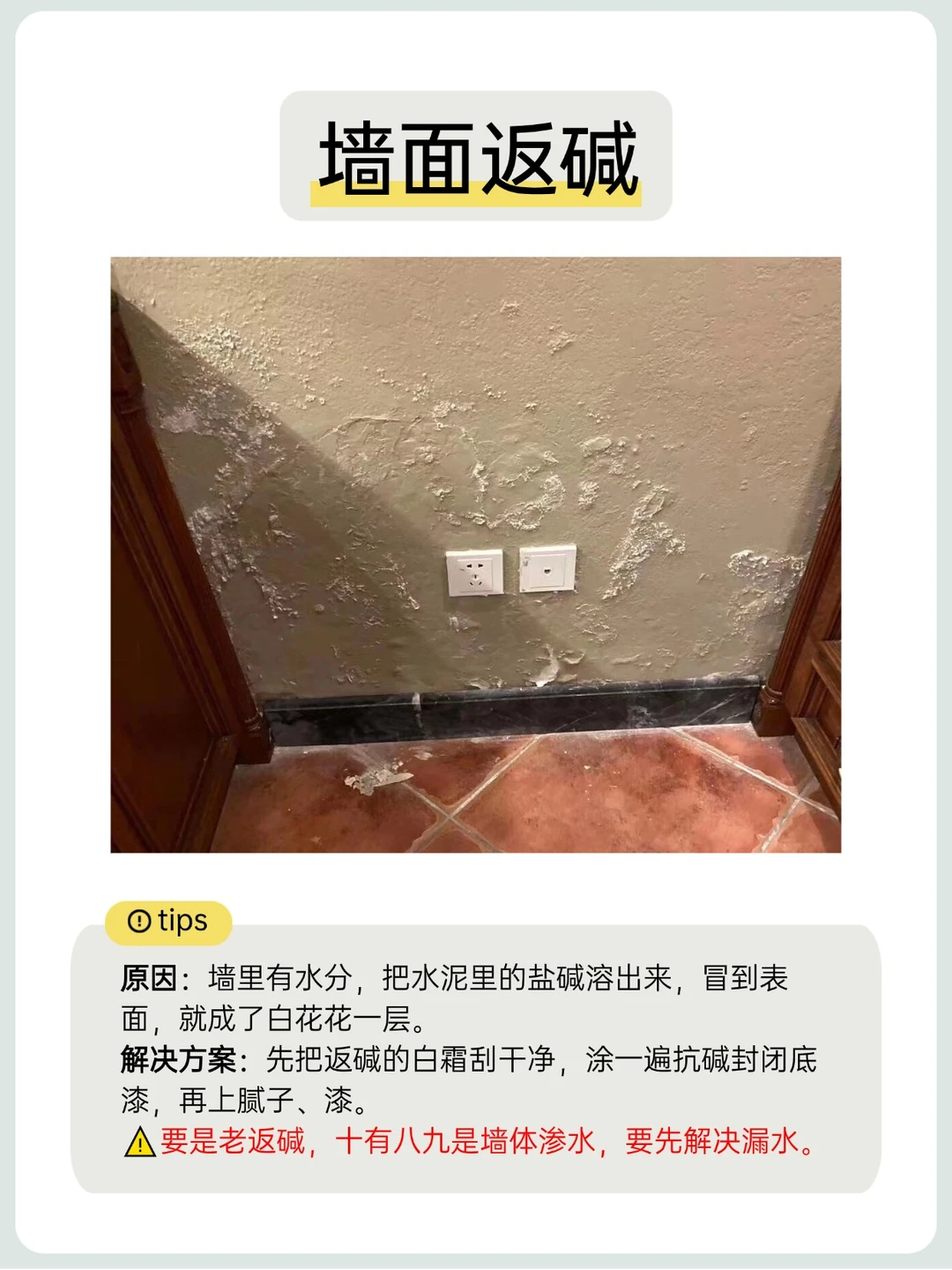 ⭐️解决方案:先把返碱的白霜刮干净,涂一遍抗碱封闭底漆,再上腻子、漆。