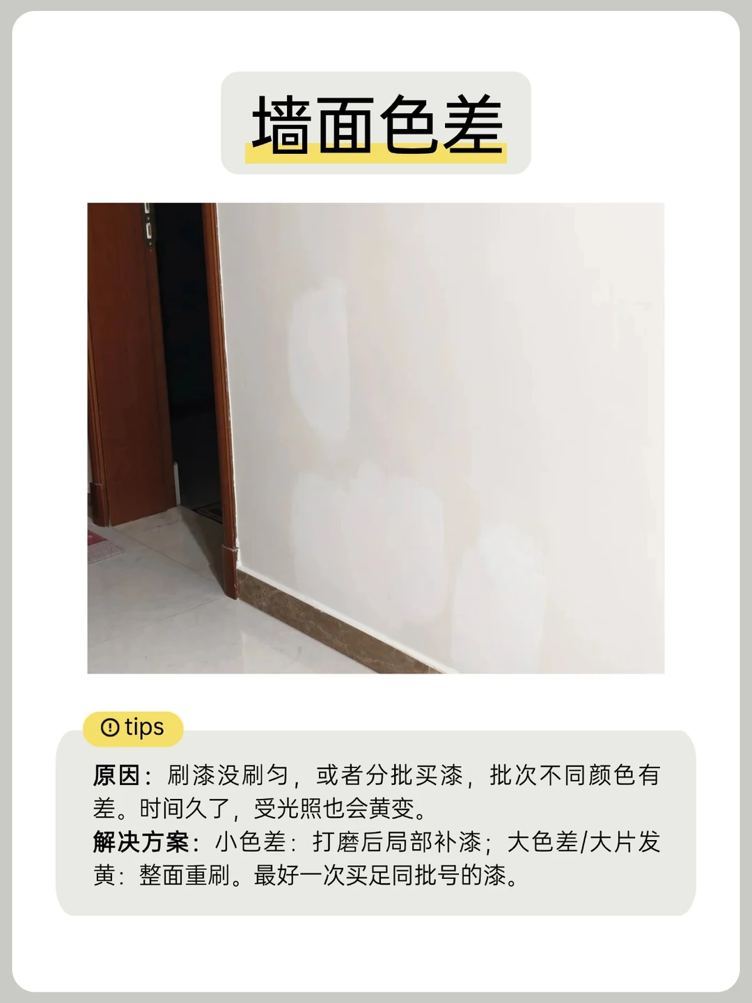 🔎原因:刷漆没刷匀,或者分批买漆,批次不同颜色有差。时间久了,受光照也会黄变。