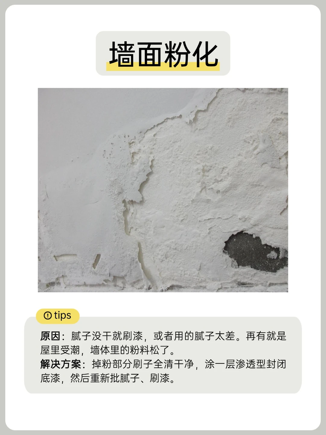🔎原因:腻子没干就刷漆,或者用的腻子太差。再有就是屋里受潮,墙体里的粉料松了。
