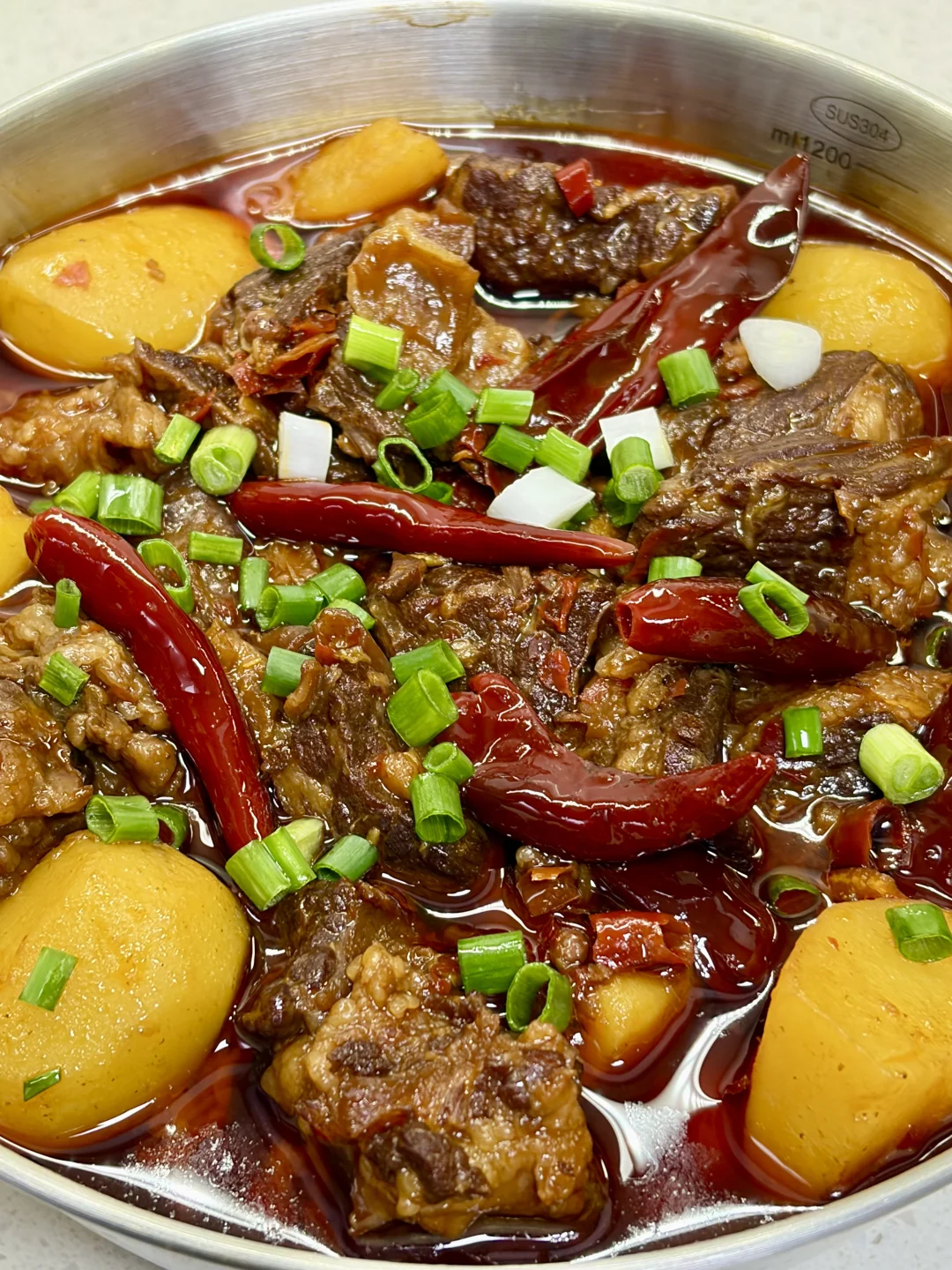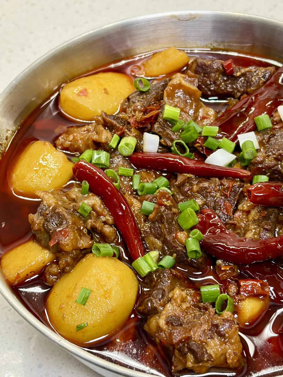 3⃣️:转入电压力锅炖40分钟,再倒入锅中,放入提前煮熟的土豆块焖煮几分钟,加入少许盐和味精,撒上葱花即可