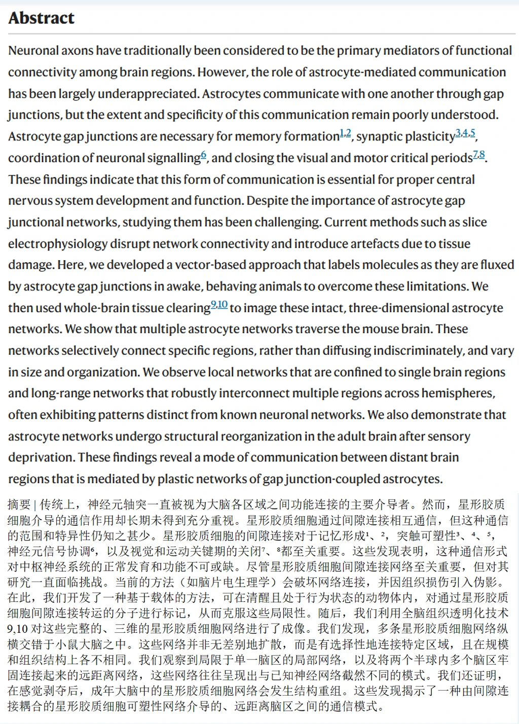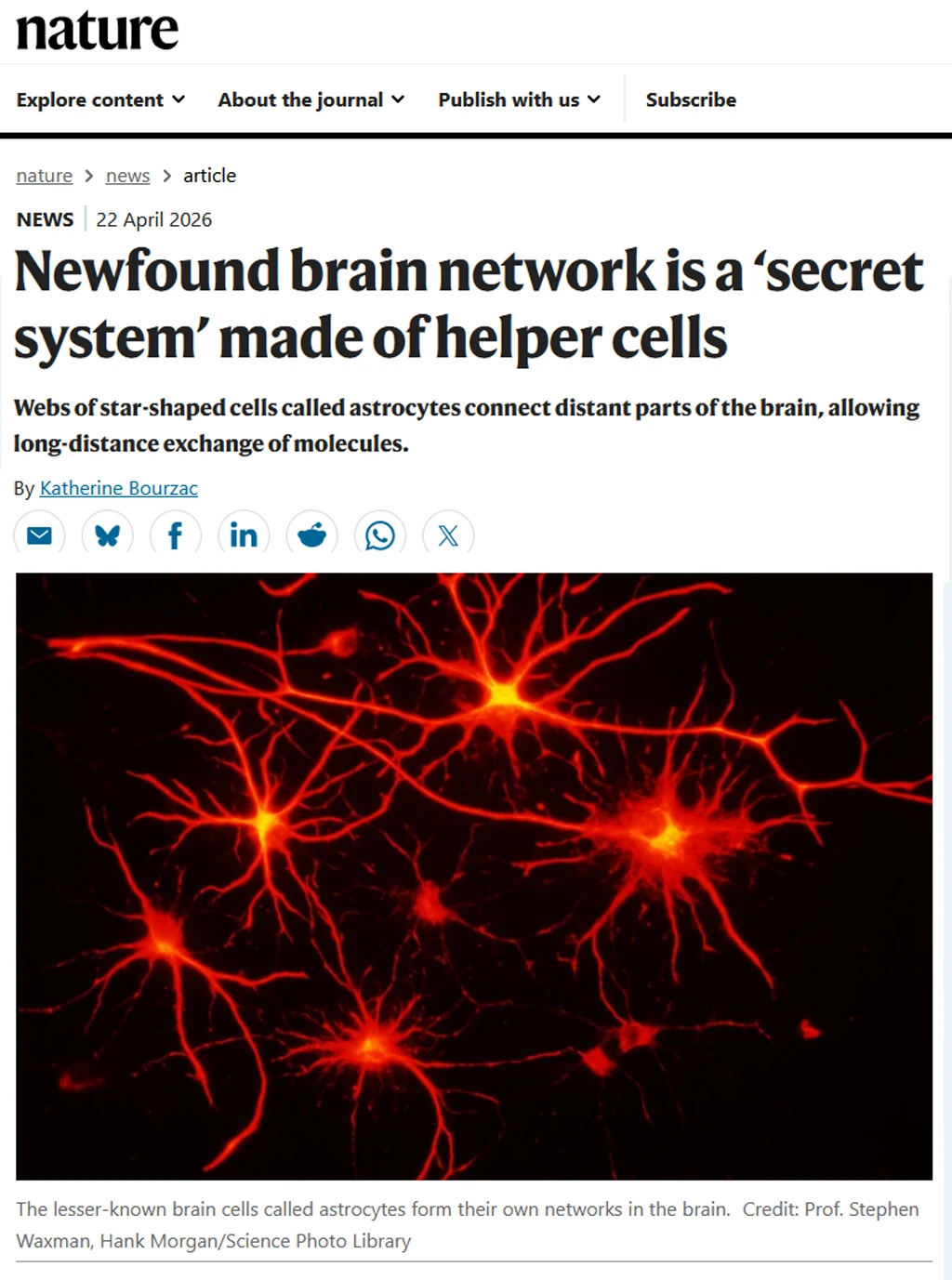 这一页要被改写了。纽约大学格罗斯曼医学院的科学家发现,星形胶质细胞根本不是单打独斗的“后勤兵”。它们通过一种叫作间隙连接的通道,手拉手连成了贯穿整个大脑的网络。这项研究发表在2026年4月22日的《自然》杂志上。
