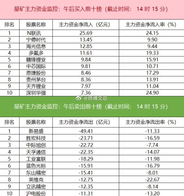 【主力资金监控:通信板块净流出超163亿】星矿数据显示,今日主力资金净流入能源金属、半导体、基础化工等板块,净流出通信、电子、电新行业等板块,其中通信板块净流出163.91亿元。个股方面,N联讯资金净买入25.69亿元位居首位,宁德时代、海光信息、多氟多主力资金净流入居前;新易盛遭净卖出49.41亿元位居首位,胜宏科技、中际旭创、天孚通信主力资金净流出额居前。财经A股 今日看盘