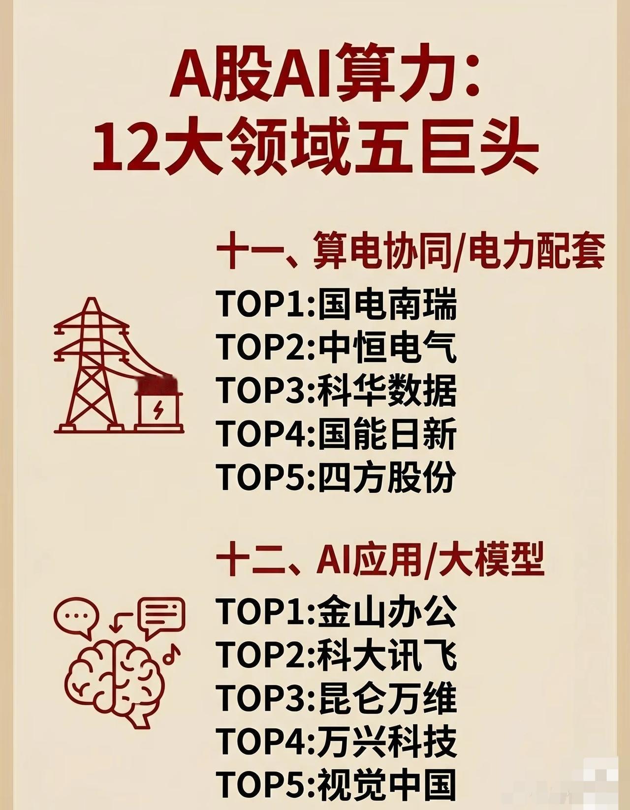 算电协同是算力“能源底座”,五巨头为:国电南瑞(电网自动化+储能,算电协同调度)、中恒电气(数据中心供电+充电桩,电力配套方案)、科华数据(UPS+储能,数据中心供电核心)、国能日新(新能源功率预测+算电协同,能源管理)、四方股份(继电保护+智能配电,电力系统配套)。