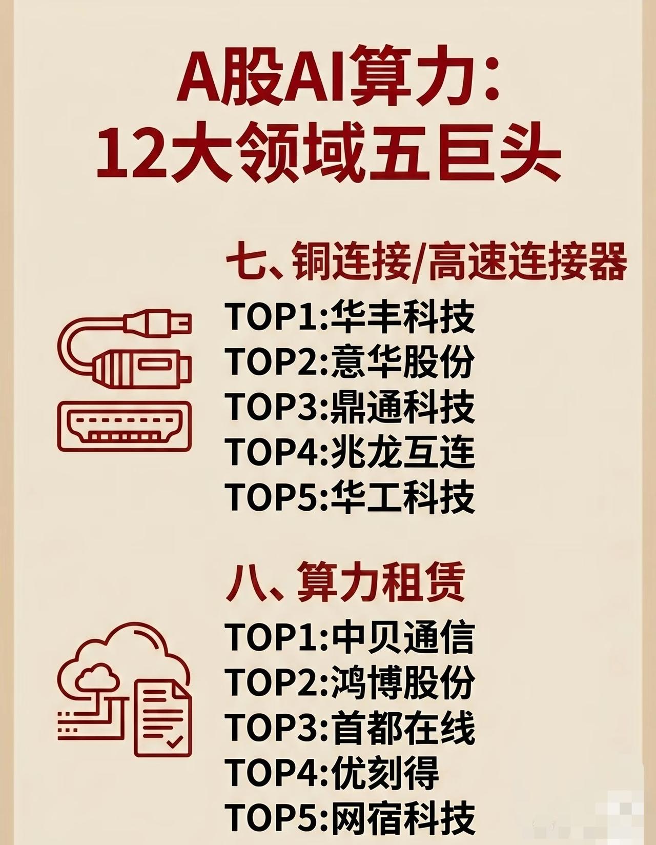 铜连接是短距离高速传输的关键,五巨头为:华丰科技(高速背板连接器,军工+民用工控突破)、意华股份(光伏+通信连接器,高速连接器放量)、鼎通科技(连接器组件,模具+结构件精密制造)、兆龙互连(数据电缆+连接器,算力中心布线核心)、华工科技(光连接+电连接,光模块+连接器双主业)。