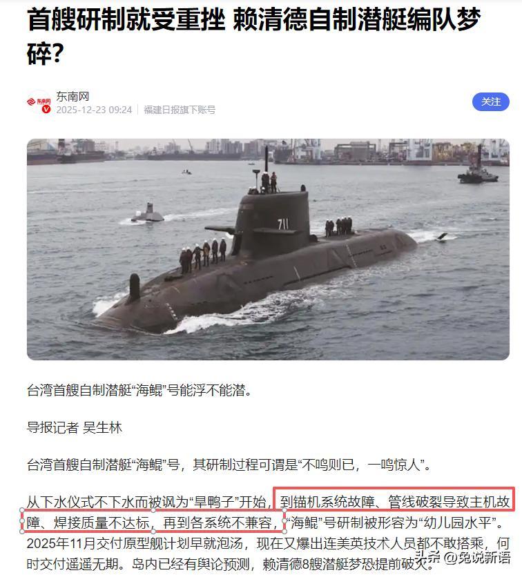 有了印度的鼎力帮助,这下一切就可以解释得通了。“海鲲”号面临诸多问题,如管线破裂进水,柴油机故障频发、锚机系统故障、焊接质量不达标、各系统不兼容,根本就无法作战,可以说潜艇上能出现的毛病它是一个不落。采用印度生产的先进潜艇系统和元件,并且还有众多维修过万国潜艇的印度高级工程师帮忙,就这样还出现这么多毛病,只能说台湾得好好反省反省自己。