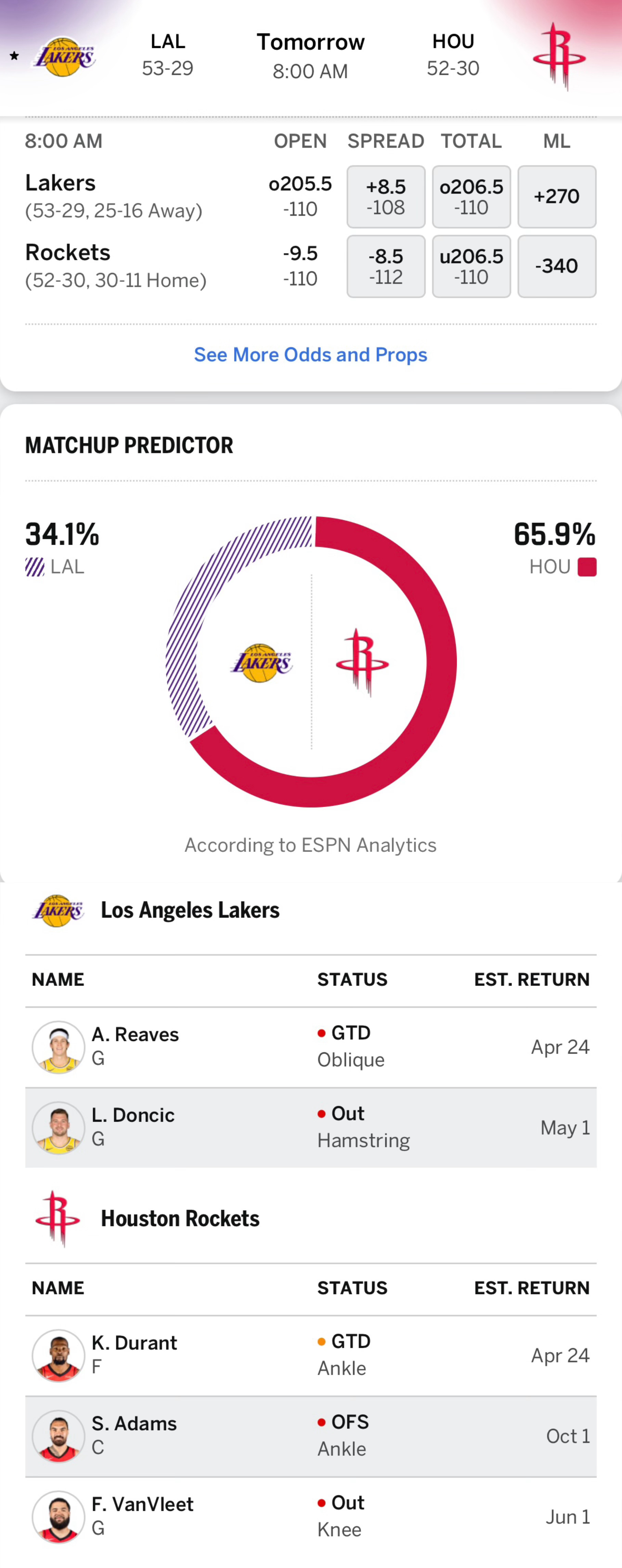 3-0还是2-1 ? 湖人明日8点客场对阵火箭,ESPN获胜概率:湖人34.1%、火箭65.9%。