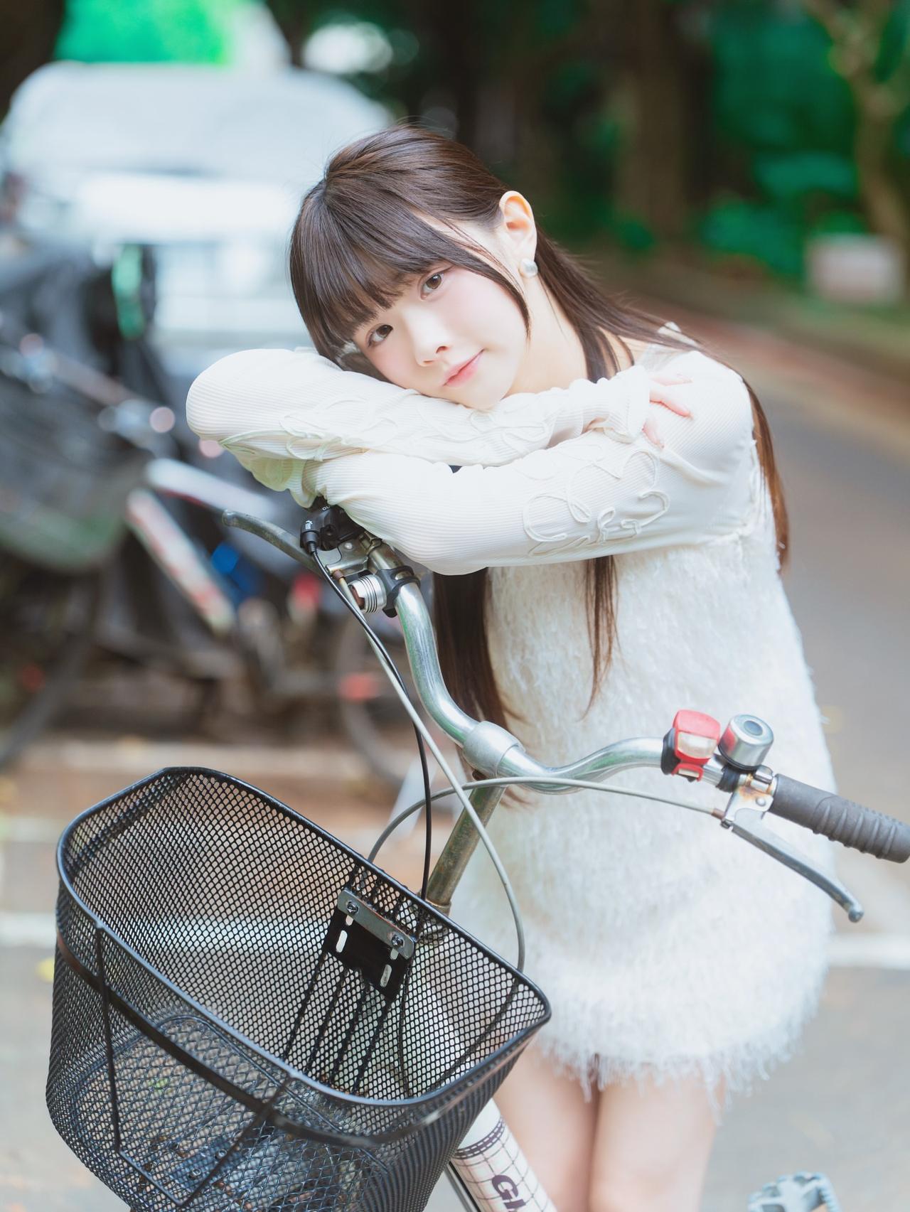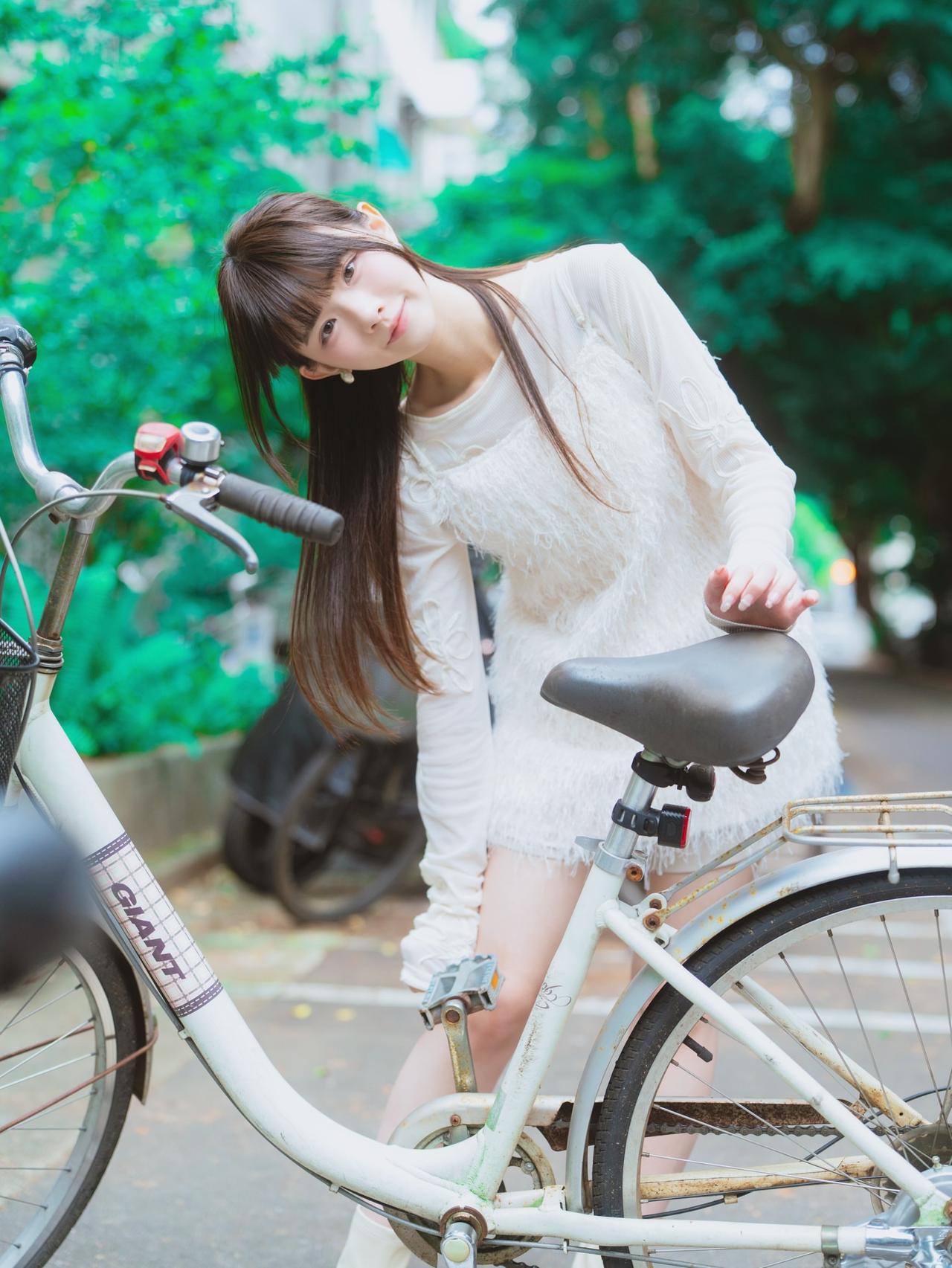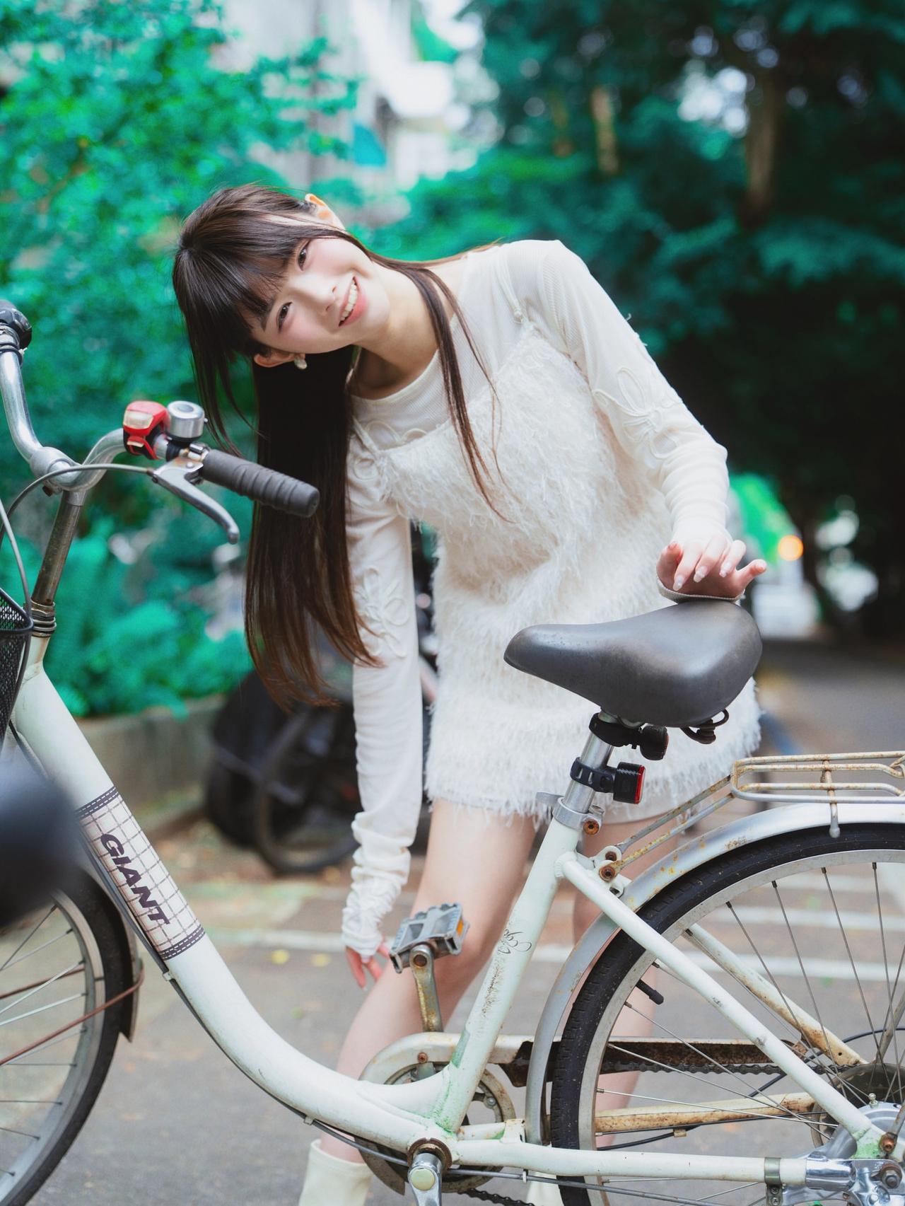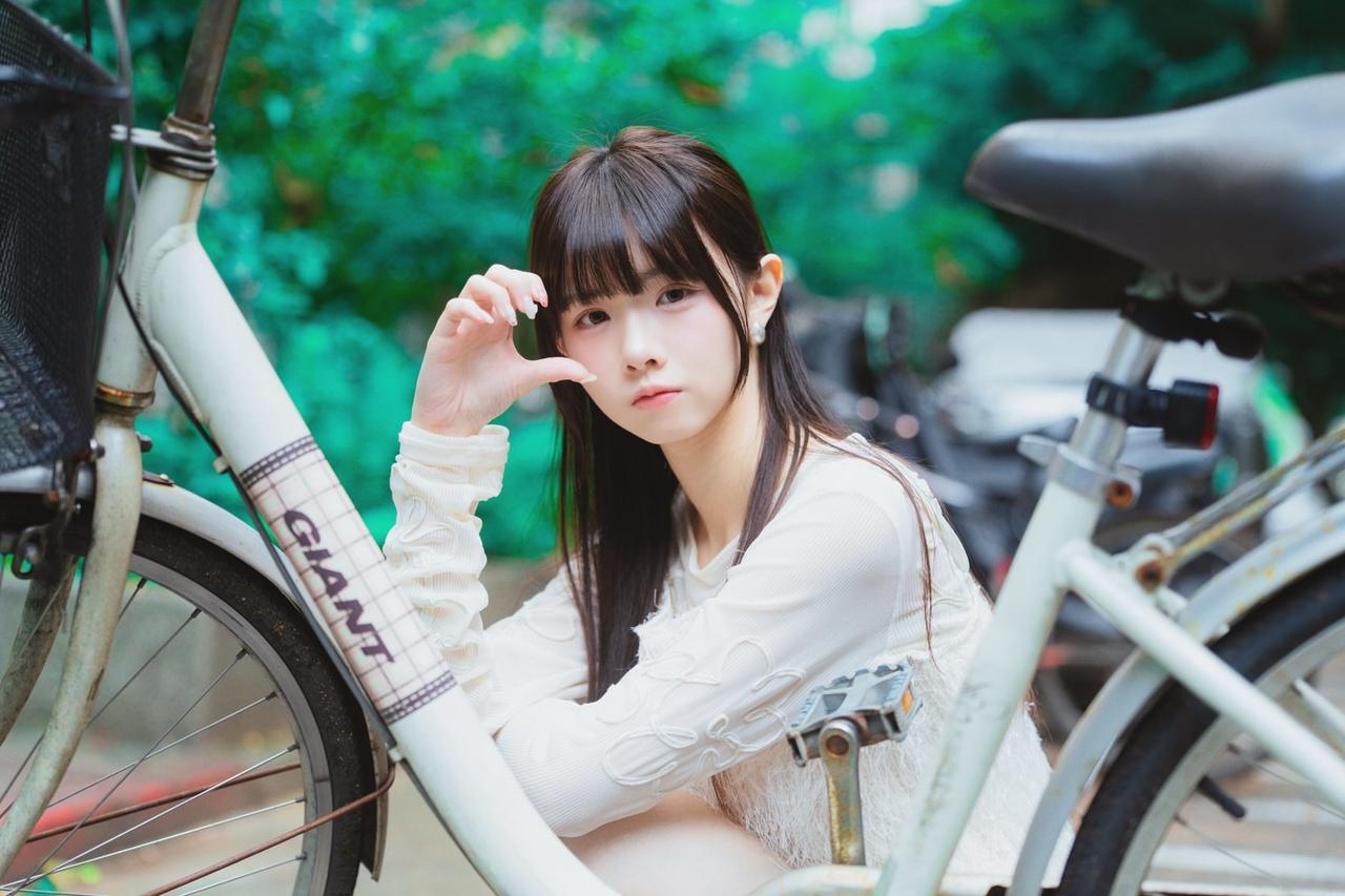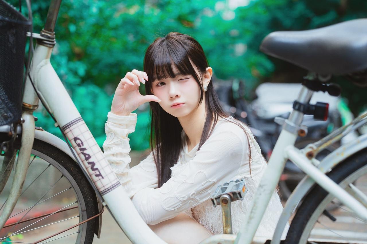 清新少女与复古单车,绿意盎然中感受宁静时光。