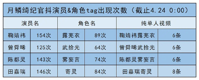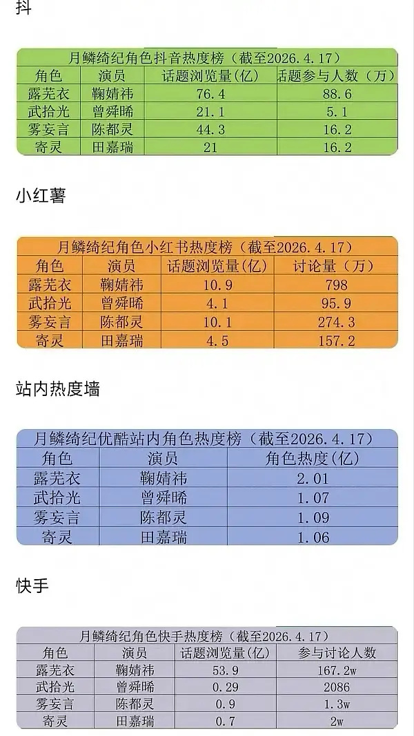 月鳞绮纪收官主演角色数据《月鳞绮纪》收官露芜衣(鞠婧祎 饰)、武拾光(曾舜晞 饰)、雾妄言(陈都灵 饰)、寄灵(田嘉瑞 饰)四位主演角色数据🈶看看谁吸粉了,谁出圈了