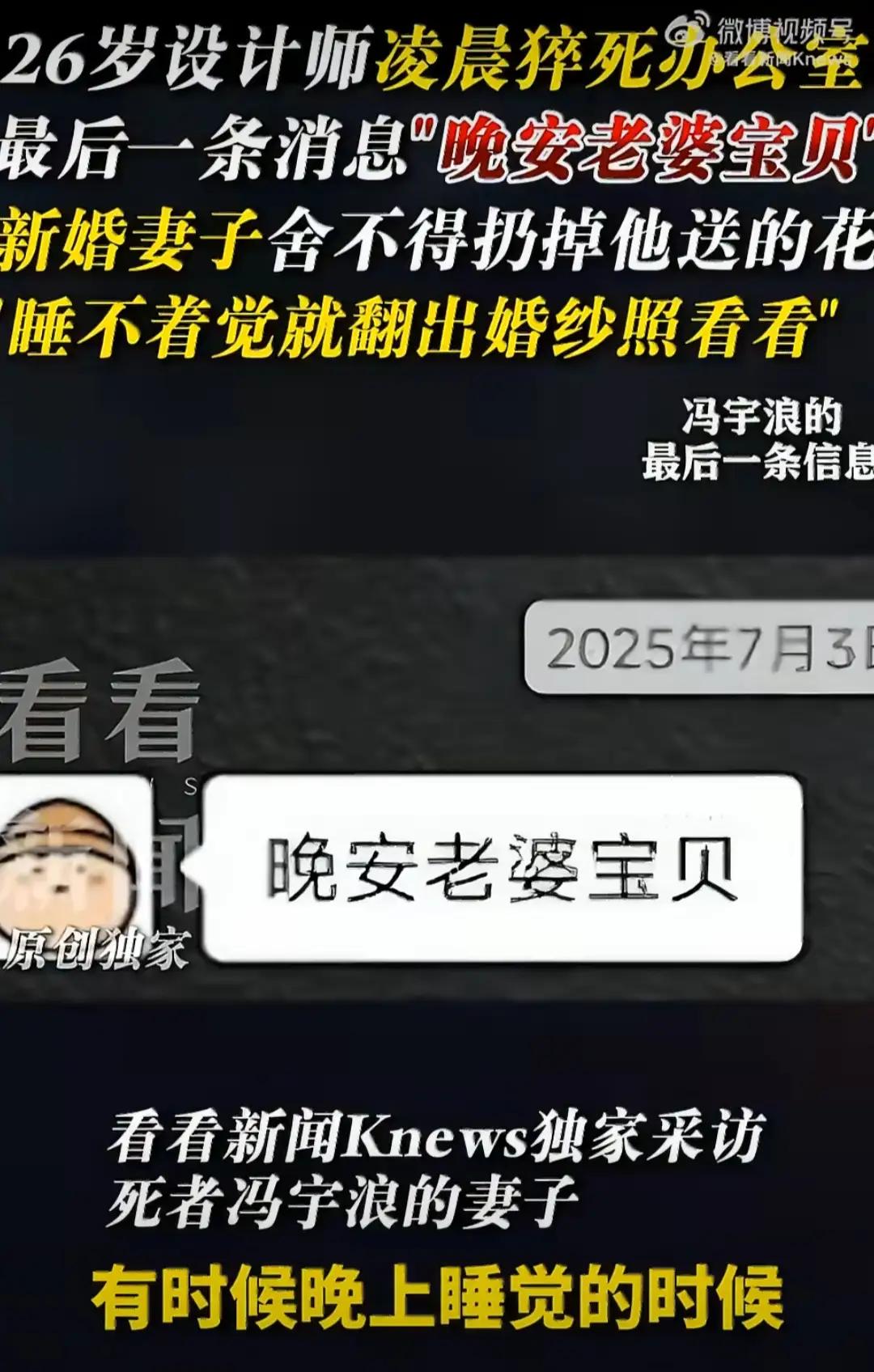 起因是26岁的建筑设计师小冯工作强度比较大,加班可谓是家常便饭,去世前的那个月加班19天。他去世的那天夜晚,在公司加班到半夜,凌晨3点32分给妻子发微信“晚安,老婆宝贝”后就躺在办公室的折叠椅上。