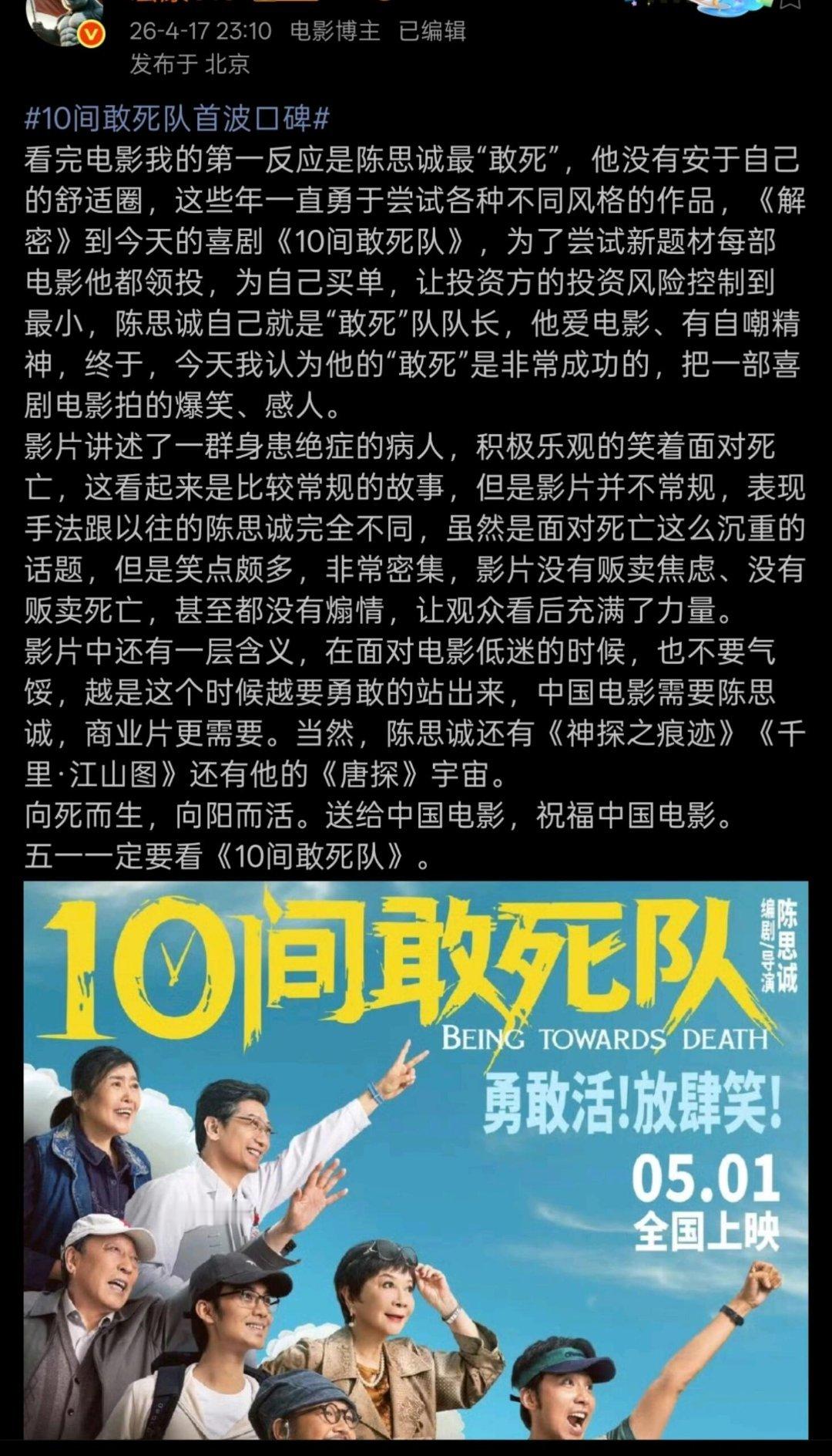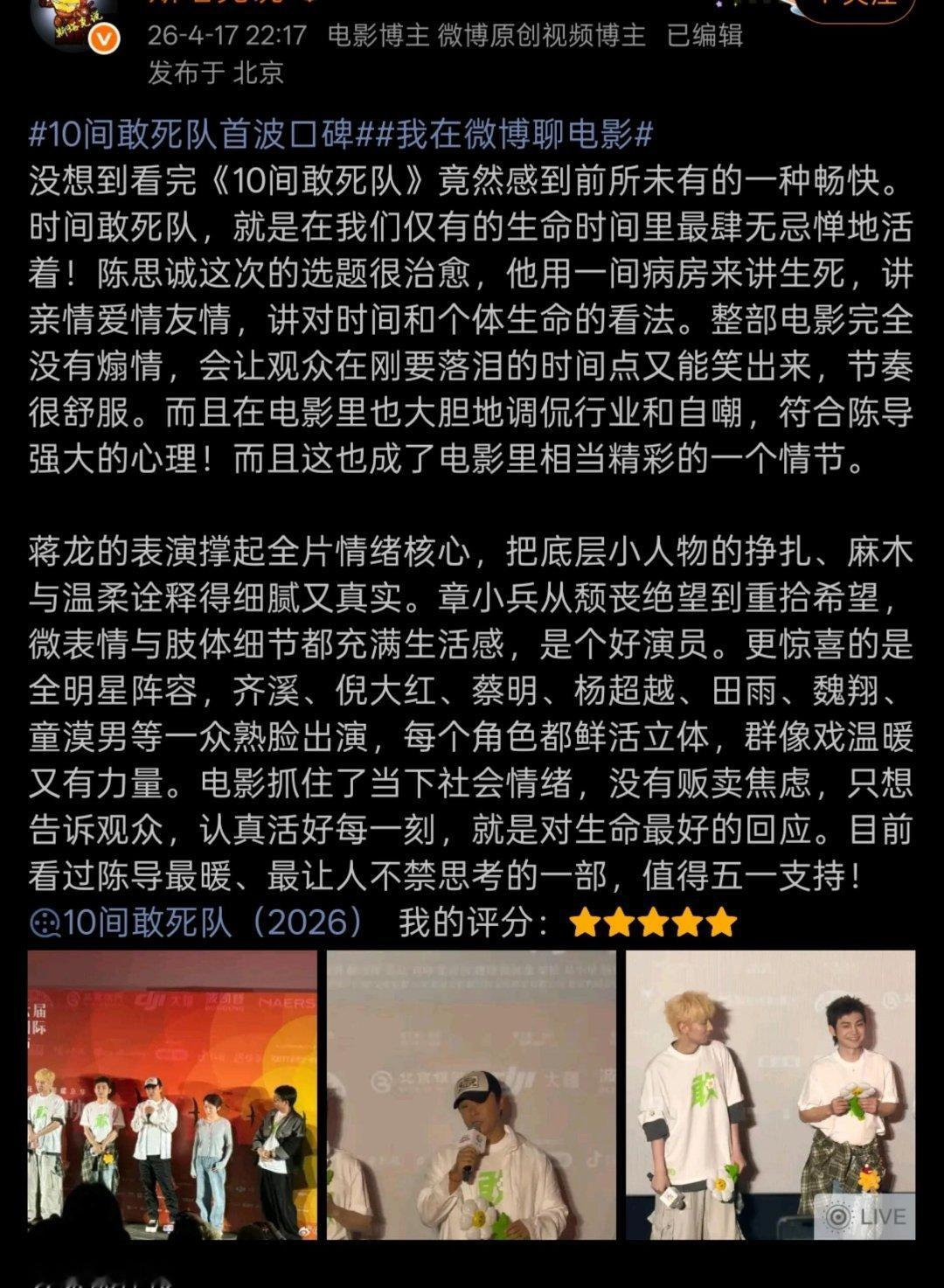 10间敢死队首映口碑10间敢死队首映礼口碑这不只陈思诚的新作,这还是北影节139个国家1286部电影里杀出来的前16部天坛奖入围作品,也是北影节放映后,场刊评分国产片第一🔥除了陈思诚,倪大红、蔡明、田雨老戏骨➕蒋龙、齐溪、杨超越、王子川、张弛等新人阵容也值得一看 ,五一上映不见不散!