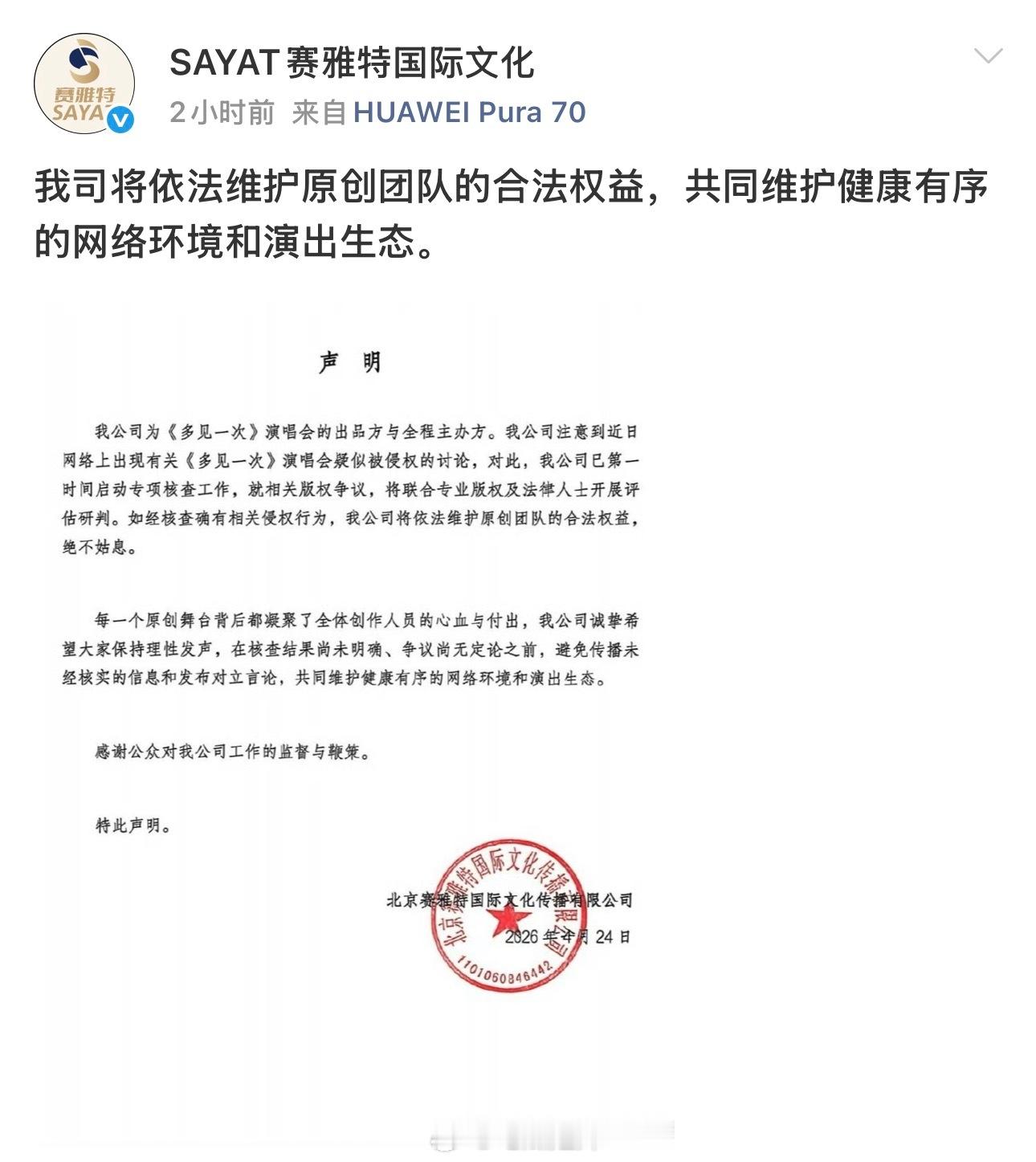 檀健次演唱会主办方声明 檀健次演唱会主办方声明,称已第一时间启动专项核查工作,如确有相关侵权行为,将依法维护原创团队权益。