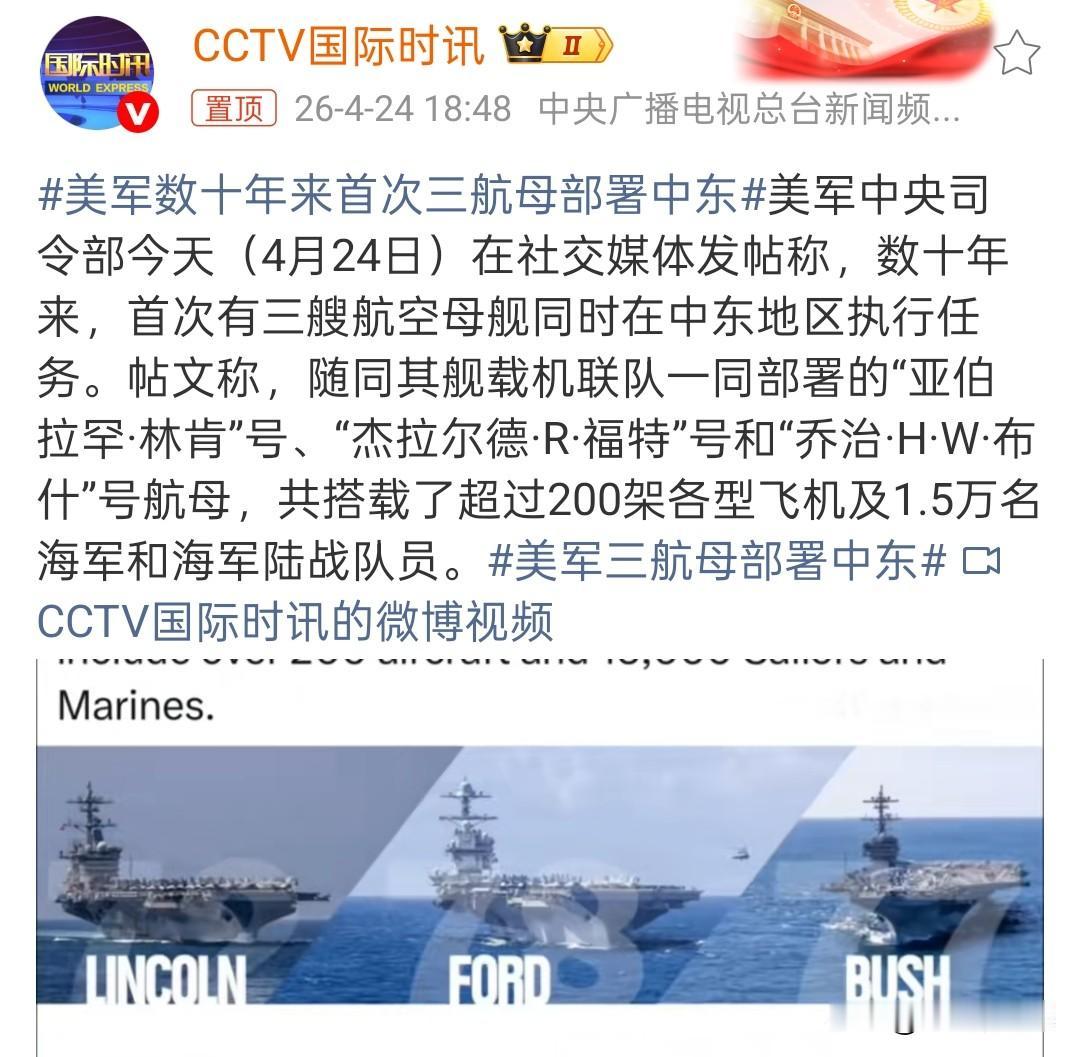 4月24日中东上演重磅场面,美军凑齐林肯号、福特号、布什号三艘核航母同域部署!