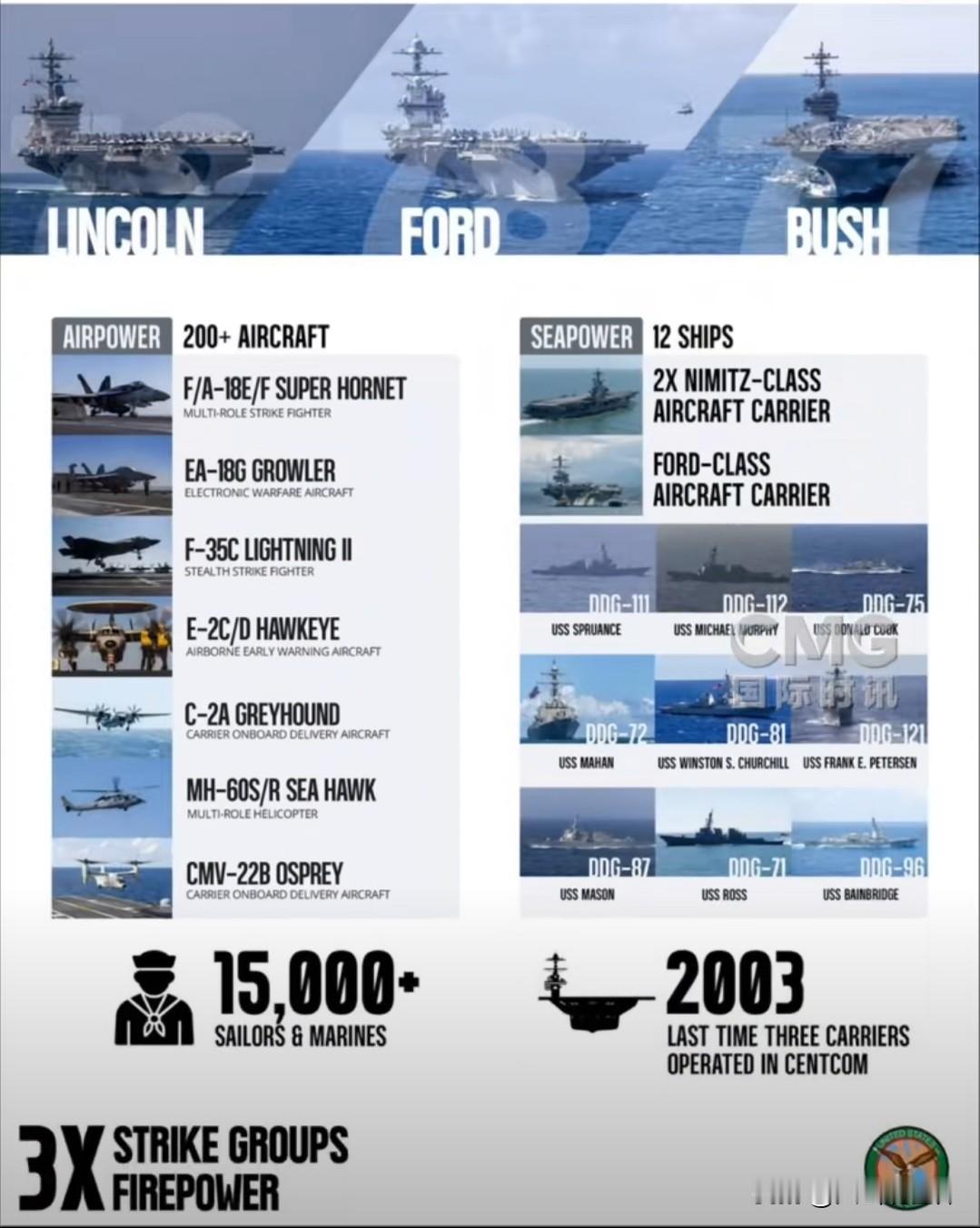 这是自伊拉克战争之后,整整二十多年来美军首次在中东摆出三航母大阵,搭配16艘护航战舰、200多架舰载机,外加6万地面部队压阵,表面威慑气场拉满。
