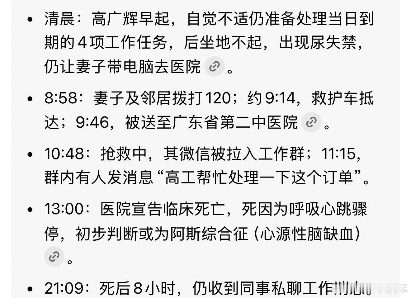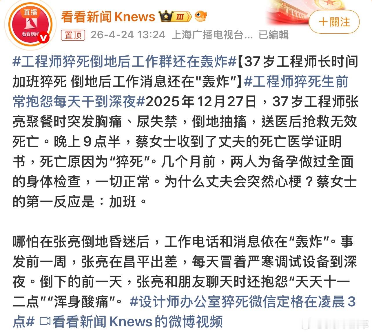 工程师猝死倒地后工作群还在轰炸哎又发生这样的事…当代职场被“随时在线”绑架,无休止加班、无边界工作成常态。大家被迫24小时待机,用健康换业绩,用透支换生存。别让内卷吞噬人性,别让职场冷漠透支每一个努力生活的人。好好活着,远比无限加班更重要。