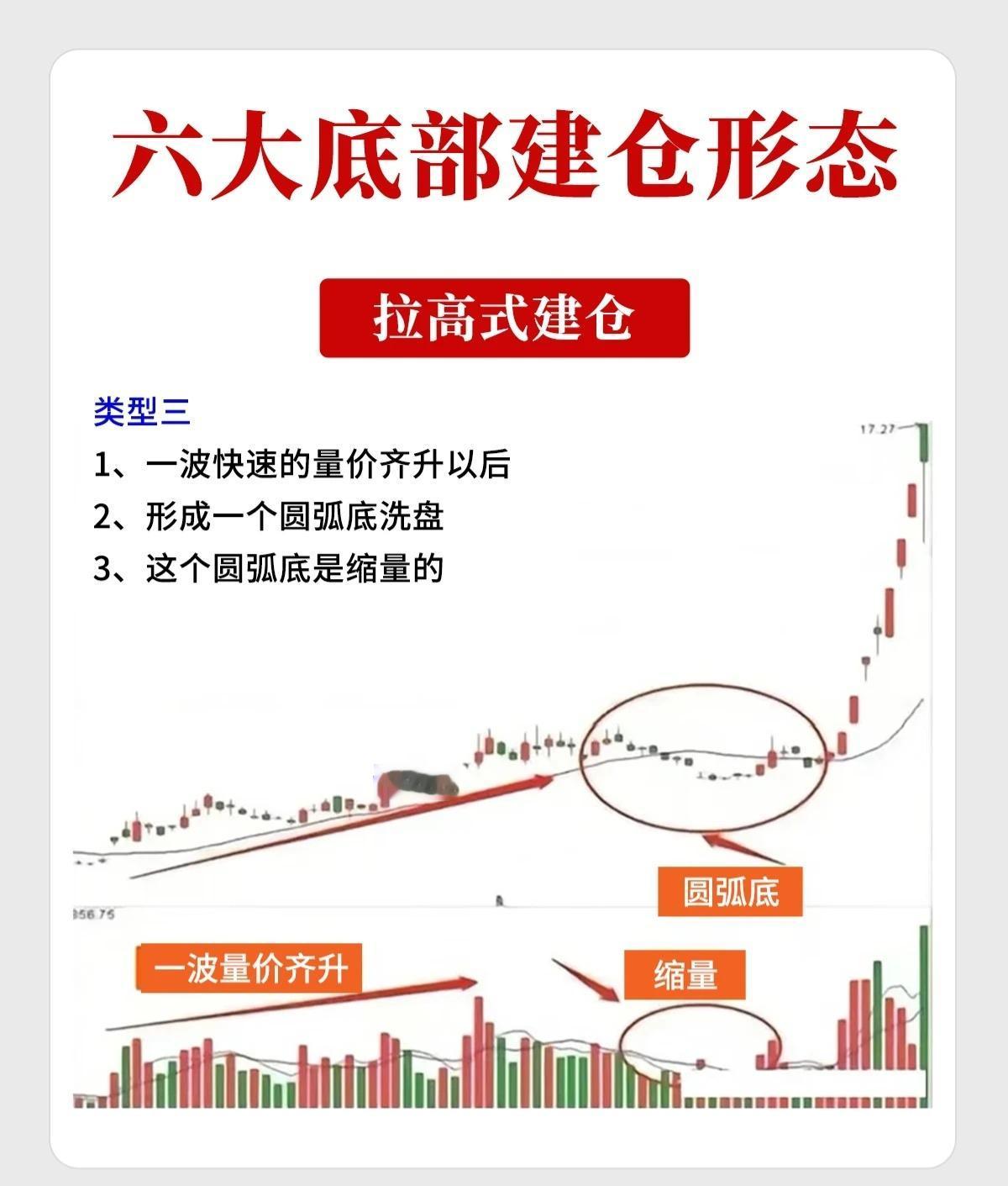2. 圆弧洗盘:随后股价进入长时间的横盘整理,形成一个平滑的圆弧底形态。