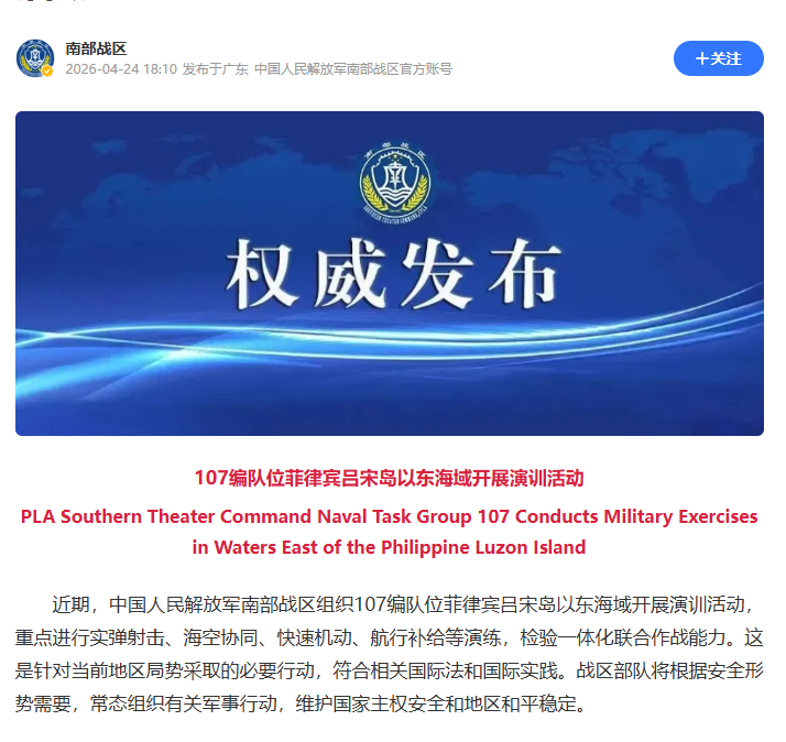 南部战区,拉了一个编队跑到菲律宾吕宋岛以东搞实单演习去了美日菲在吕宋岛以西搞肩并肩,我们直接跑到东边去了