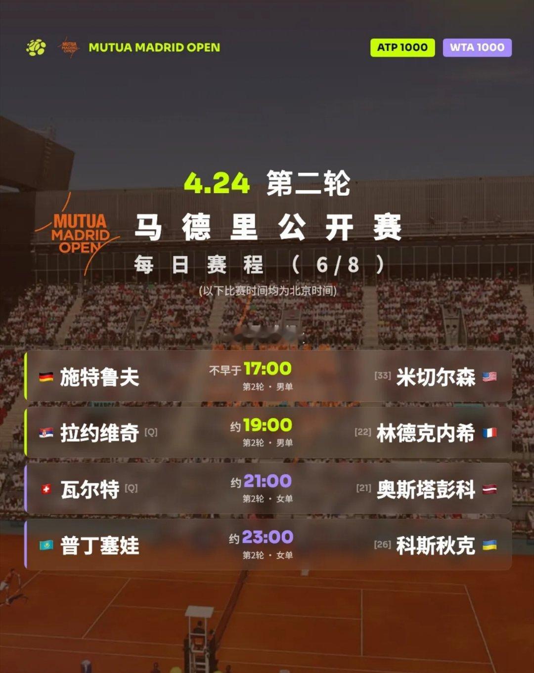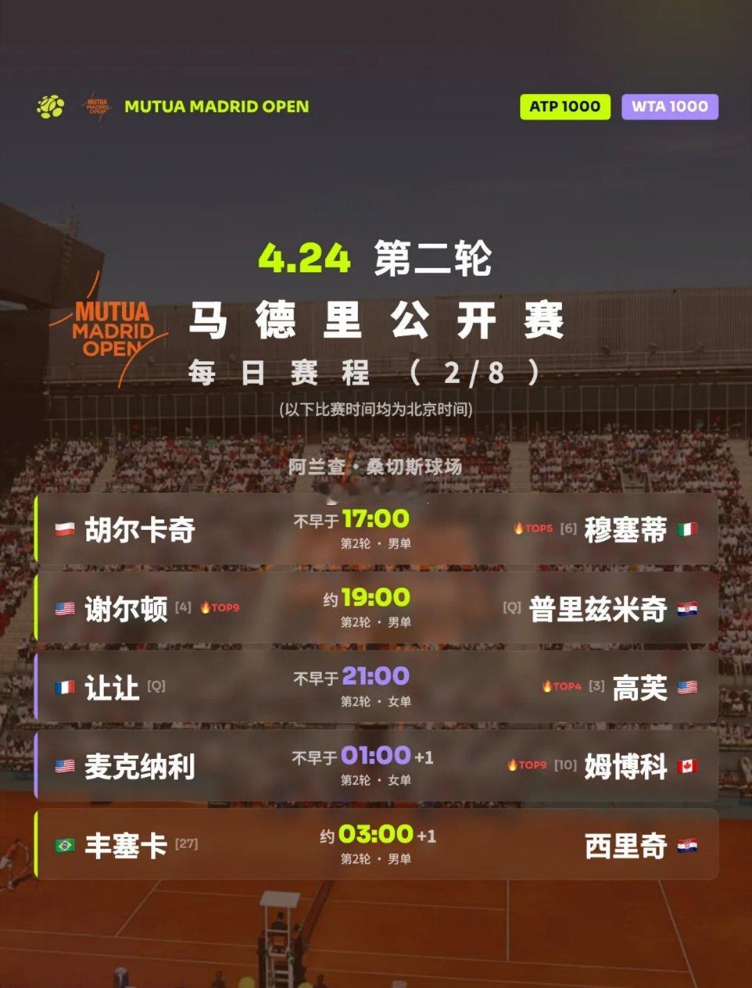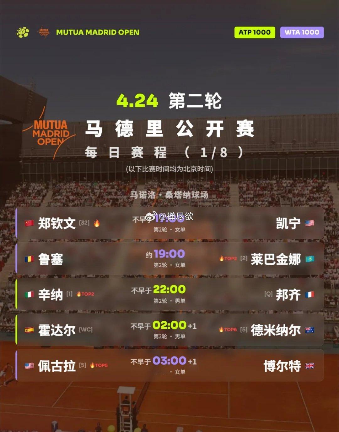 郑钦文首战就碰肯宁、 交手 2比0 领先; 张帅刚横扫吕斯、 第二轮直接挑战澳网冠军凯斯。今晚还有辛纳、高芙、菜巴金娜、霍达尔、穆塞蒂一整排焦点战、 马德里这张赛程真的从白天炸到凌晨。完整赛程看图、 所有时间为北京时间。郑钦文网球郑钦文马德里2比1肯宁