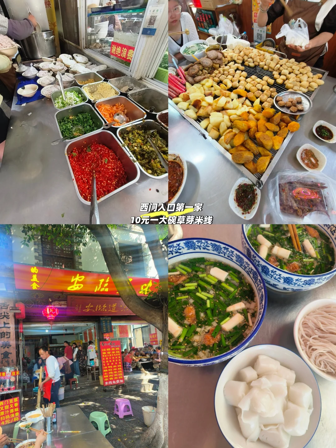 ✓临安味道。西门入口左手边第一家。10元一大碗草芽米线,米线自助。围炉的烤豆腐和土豆自选,5毛一坨。