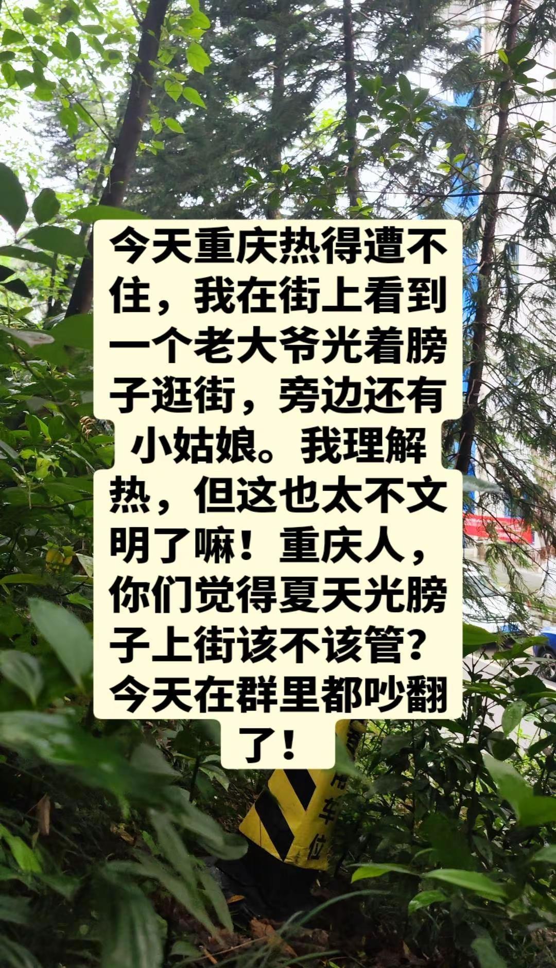 重庆热得遭不住,光膀子上街该不该管? 今天重庆热得遭不住,我在街上看到一个老大爷光着膀子逛街,旁边还有小姑娘。我理解热,但这也太不文明了嘛!重庆人,你们觉得夏天光膀子上街该不该管?今天在群里都吵翻了!重庆 重庆高温 光膀子 重庆文明