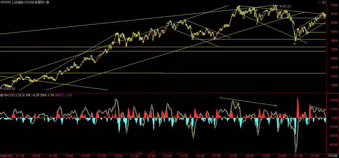 继续阴十字星洗盘,固守60日线!3大指数低开低走,盘中一度大幅下探,尾盘跌幅明显收窄,收盘分别下跌0.33%,0.69%和1.41%。成交量,两市合计26419亿,相比昨天萎缩1626亿。板块方面,仅锂矿,化工,半导体,电池等少量板块逆势上涨,其它大部分板块下跌,其中军工,通信设备,消费电子,影视院线,造纸,算力,电网设备,元器件等跌幅居前。承接了昨天洗盘走势,今天继续下探,接近回踩60日线而快速拉起,说明60日线支撑较强,是有效突破。一旦回踩完毕,必然会有长阳拉起,因此,对于盘面走势不必忧心,也就几天的事。周线来看,本周收小阳线,收复10与20周线,成交量有所放大,macd绿柱缩短,综合来看,周线仍需要一些时间修复,深圳两大指数周线提前进入强势状态了,为上证指明了方向。30分钟方面,macd死叉向下且绿柱缩短,指数反复沿喇叭型上轨线震荡,回踩基本结束,等待继续上涨。大盘综合评分:5.75分(满分为10分,5.5分及格),短线操作难度评分: -25分(满分为100分,60分及格),市场情绪:差(主观感受,主要分为好,差,中性),市场状态:中期处于强市中,短期看震荡。两市涨跌比2013:3135,涨跌停比59:23,下跌家数较多,跌停家数不少,操作策略:中期进攻,短期进攻。附图是上证指数30分钟和日周线图