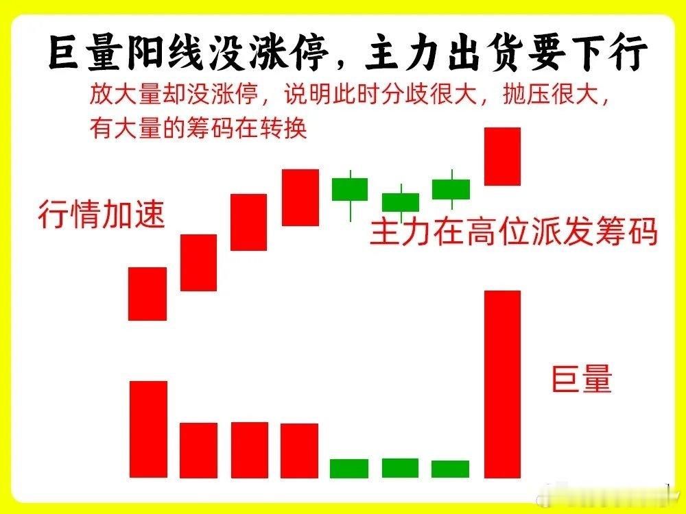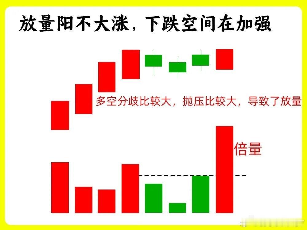 这个是大部分散户的一个误区,认为成交量放大就好!其实这是不对的!成交量越大,代表分歧越大,有买有人卖才能成交。所以量柱并不是越大越好。一、巨量阴线不大跌股价在低位盘整阶段或是上涨趋势初期,股价出现一定的涨幅,但是不会很高。出现一根阴线,下跌幅度不大,一般是3%左右,不能出现跌停,在分时图里,股价出现快速下跌,到了尾盘却收回的一个走势,但是成交量出现巨量。这是主力启动拉升之前的洗盘,清洗哪些不坚定的筹码。出现这样的阴线,代表主力在护盘,筹码得到充分换手,就形成这样的跌而不蹦的形态。二、巨量阳线没涨停股价处于上涨趋势的末期,股价已经加速上涨以后,处于阶段性的高位。出现放巨量的阳线,成交量出现巨量,而涨幅比较大,7%以上的涨幅,但是没有出现涨停,同时此时的换手率很大,大于15%,说明此时的筹码已经得到大量换手。所以巨量阳线,其实就是主力在出货。这么大的量没有出现涨停,说明抛压是真实存在,而且主力想拉涨停,会比较强势三、放量阳不大涨股价经过长时间的上涨以后,出现放量阳线,股价却没有同步上涨,这个就是典型的量价背离。高位形成十字星或是长上影线,涨幅很小。这是典型的放量滞涨,也是主力出货的表现,只是这个出货手法,属于边拉边洗。上涨动力变弱的开始四、下跌天量不反包股价处于下跌趋势,出现连续的阴线,突然成交量出现天量,成交量是最近里最大的量柱,此时的阳线,并没有有效的出现反包,而是假的阳线或是涨幅很小,连前面一根阴线的一半位置都没有突破。这就很弱了。这样的天量阳线,其实是下跌趋势的中继,下方承接很弱。往往次日的表现也是一般,大概率是低开低走好了!以上就是成交量放大的四种形态。成交量的背后逻辑,其实是值得我们细细琢磨的。先看位置,在看量能,放量必须带上价,才能量价匹配