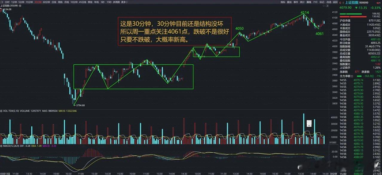 今早市场低开下探,让15分钟K线图上从4114点开始的绿色下跌一笔继续往下走。在跌到4061点时得到支撑,这个位置并没有跌破4050点。按理说,今早应该延续昨天尾盘的反弹、直接往上走,结果反而继续向下走。从4114点开始的这一笔下跌幅度较大,后面的结构虽然不会改变,但具体走法会有好几种可能。正常结构应该是:后面走出一笔上涨,创出新高,然后出现背驰,进入震荡。目前从4061点开始的绿色上涨一笔形态已经出来了,但暂时还没有创出新高。除了简单的创出新高之外,这里的走法还有以下几种:从4061点开始的这一笔上涨没有创出新高,然后走一笔下跌,并且不跌破4061点,直接构建出一个绿色的中枢。这种走法比较隐蔽,相当于提前进入了中枢震荡,说实话,很难判断后市方向。在4114点之下,走一笔绿色的下跌,直接跌破4061点。这种走法杀得比较凶,结构上仍然是中枢震荡,之后再走一笔上涨,但不超过前面的高点,这样重心就会下移,不应有太多期待。所以从今天的收盘来看,15分钟结构有点让人迷茫,很难判断。但既然15分钟看不清,不妨看一下30分钟图。从30分钟图来看,目前的关键点还是4050点。这个点位不破的话,在30分钟级别里仍有希望创出新高。不过下周一可以先重点关注4061点:只要这个点位不被跌破,那么突破4114点创出新高的概率非常大。