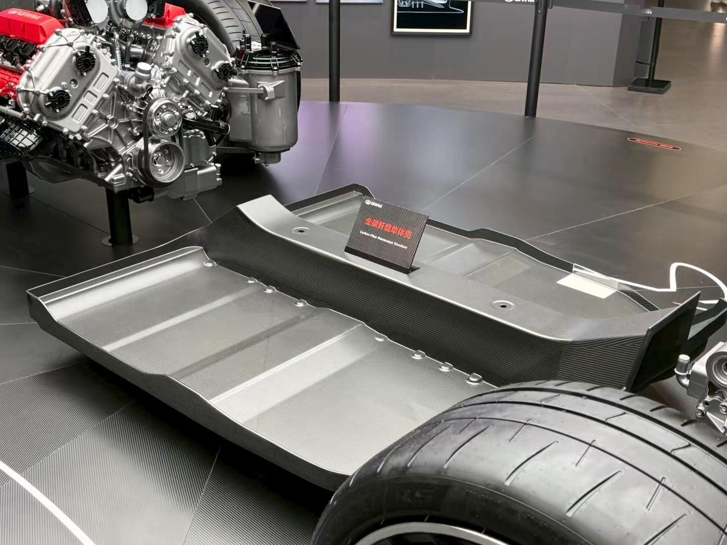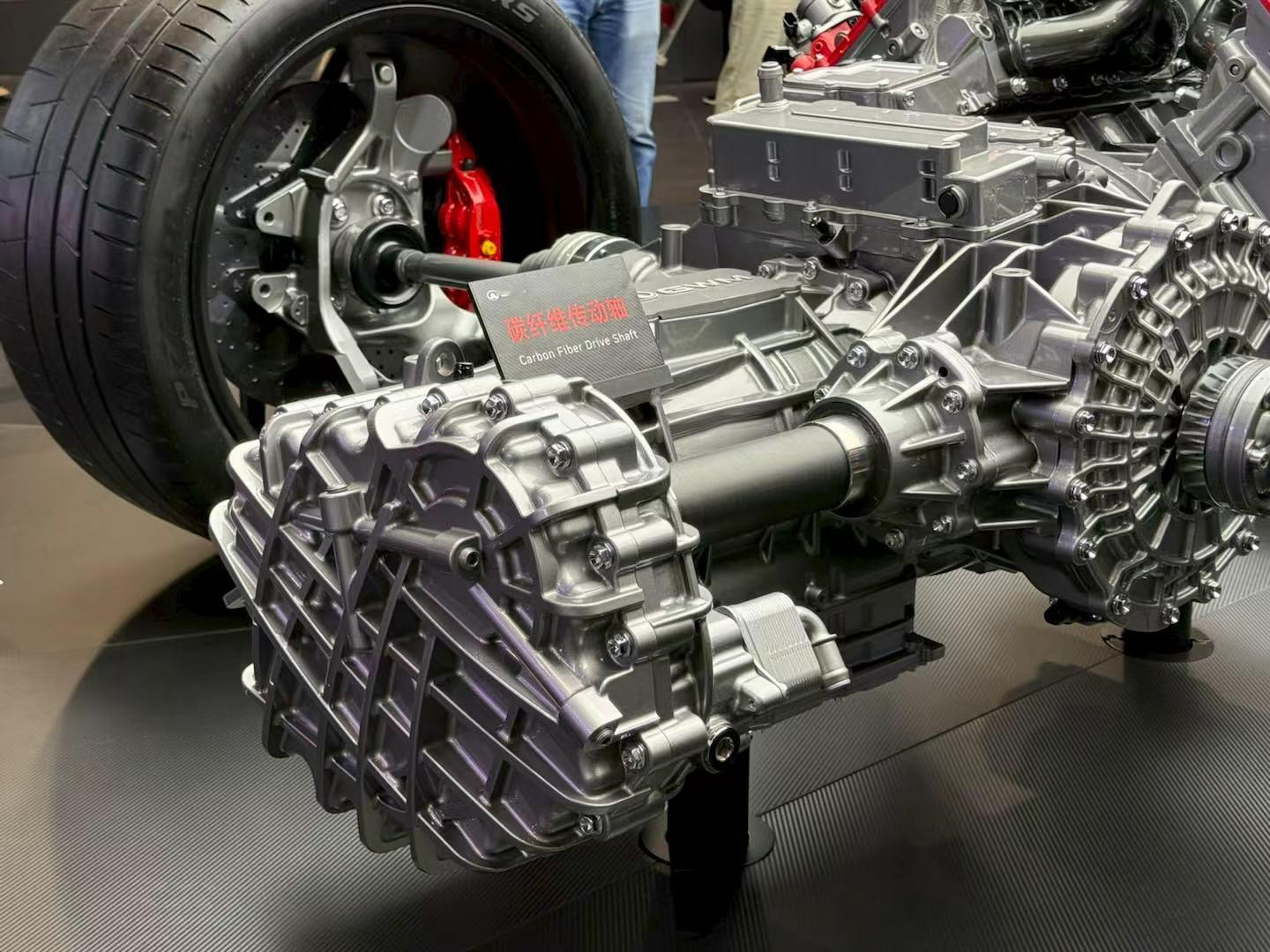 并且为了更好的平衡整辆车的重量分布,长城汽车还用上了后置变速箱,这也是中国品牌第一个后置变速箱的动力系统。而且轻量化也做得很到位,传动轴是碳纤维,也上了碳纤维单体壳座舱,看齐那些海外超跑。