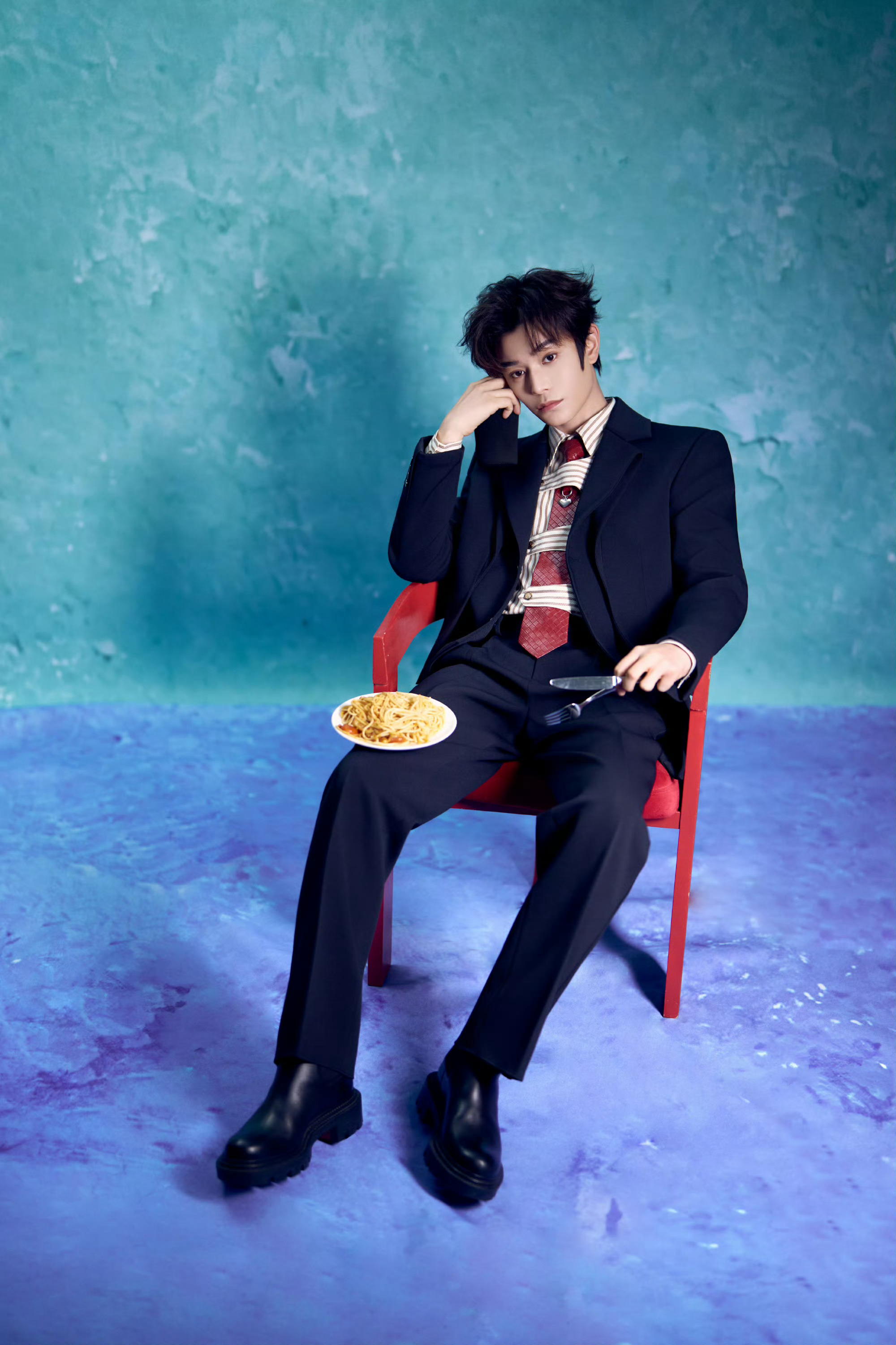 丁禹兮 今日品牌活动造型,一身西服套装,搭配条纹衬衫、皮革编织领带… 层次分明的