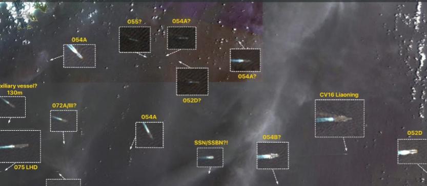 图片里清清楚楚显示,咱们解放军已经在南海集结了一支庞大的水面战斗群,一眼看过去,全是硬家伙,典型的航母加两栖特混编队配置。