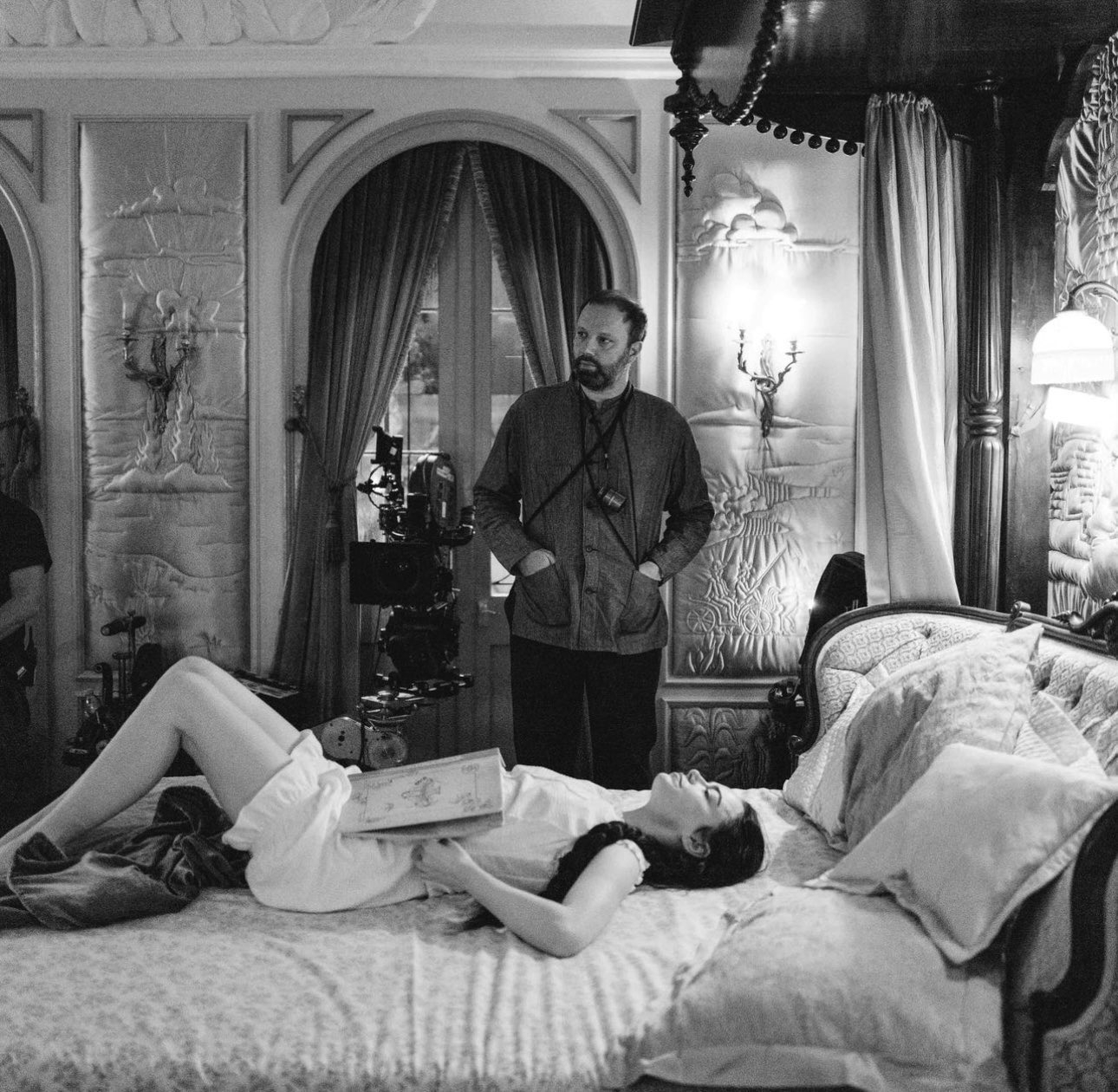 《可怜的东西》(2023)片场的艾玛·斯通与欧格斯·兰斯莫斯