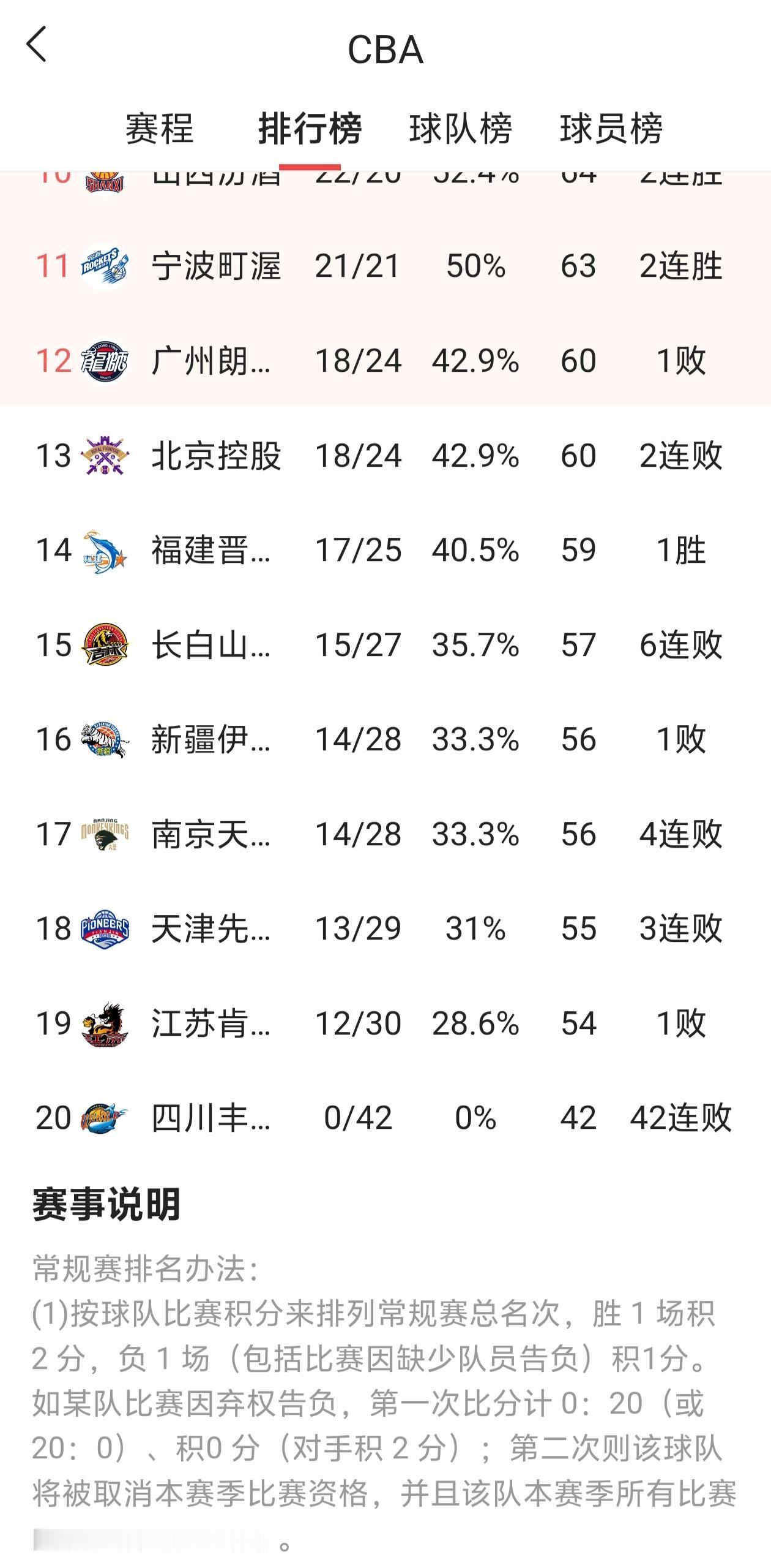 CBA大洗牌,第一名和倒数第一名令人震惊。截止4月25号,排行榜上显示,CBA20支球队中,上海队以23连胜和90.5%的胜率稳居第一,而四川队以0胜42场全败的战绩垫底。上海队本赛季是真厉害啊!大家都想说,整个赛季全败的四川队还要不要保留在CBA?