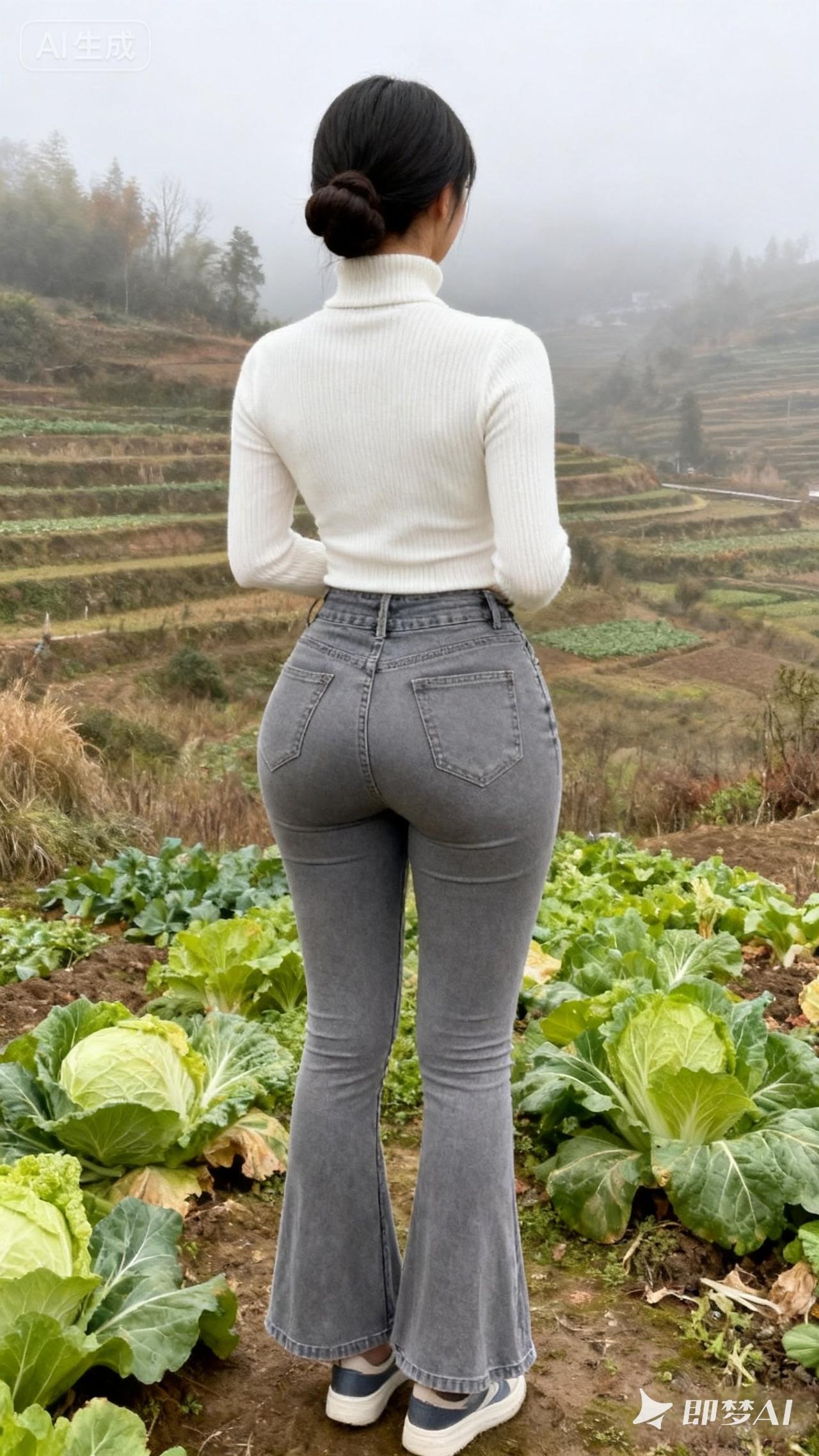 田园风光中的时尚穿搭,背对镜头,感受自然之美。