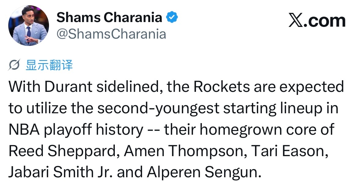 Shams:杜兰特缺阵,休斯顿火箭预计将派出NBA季后赛历史上第二年轻的首发阵容,