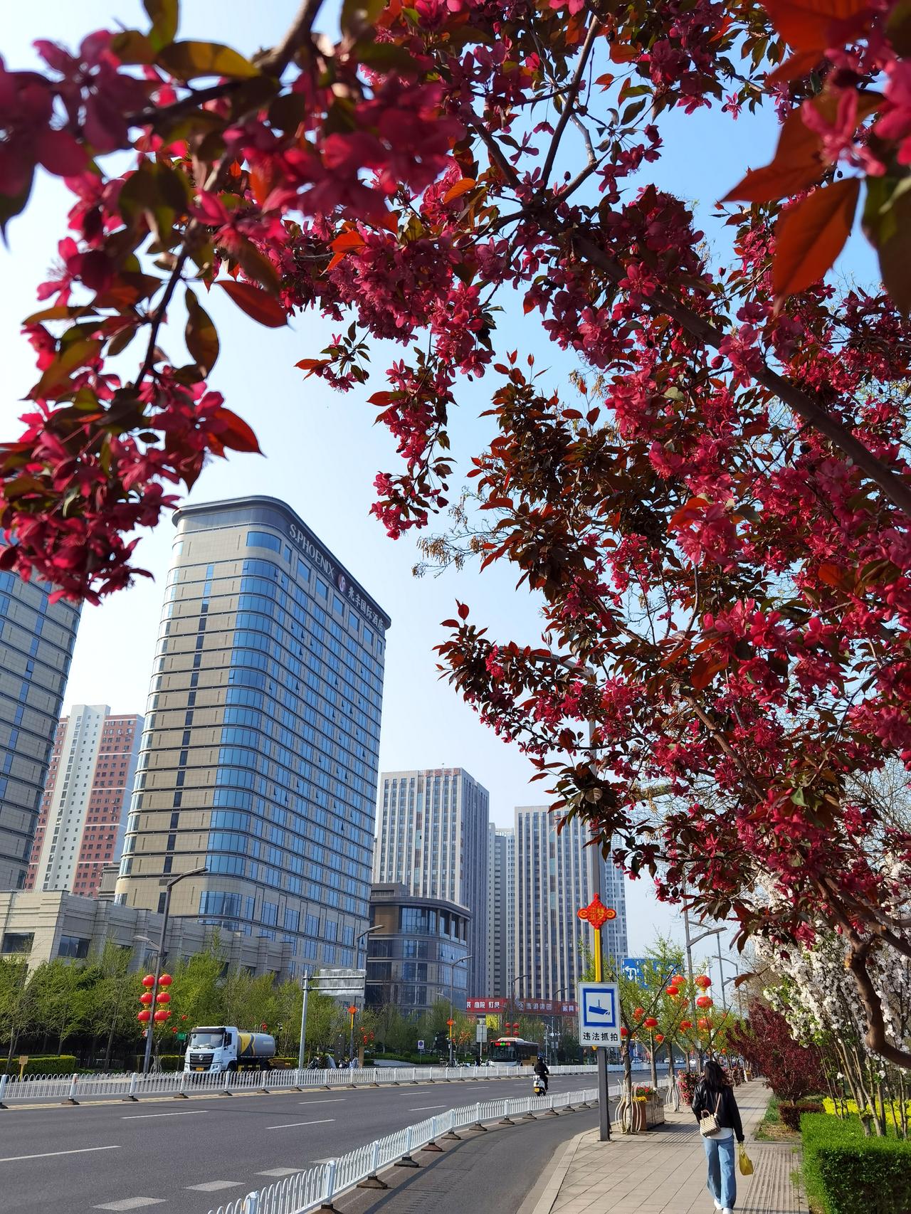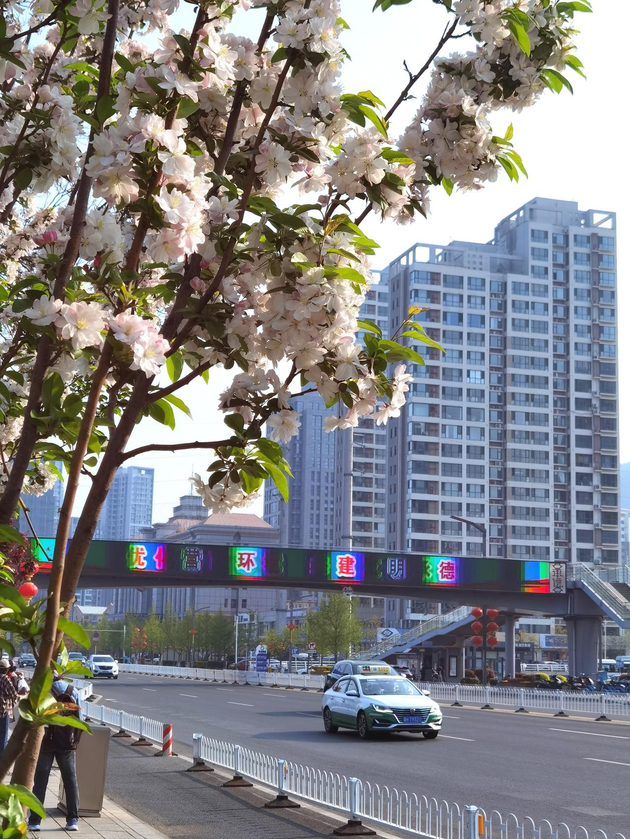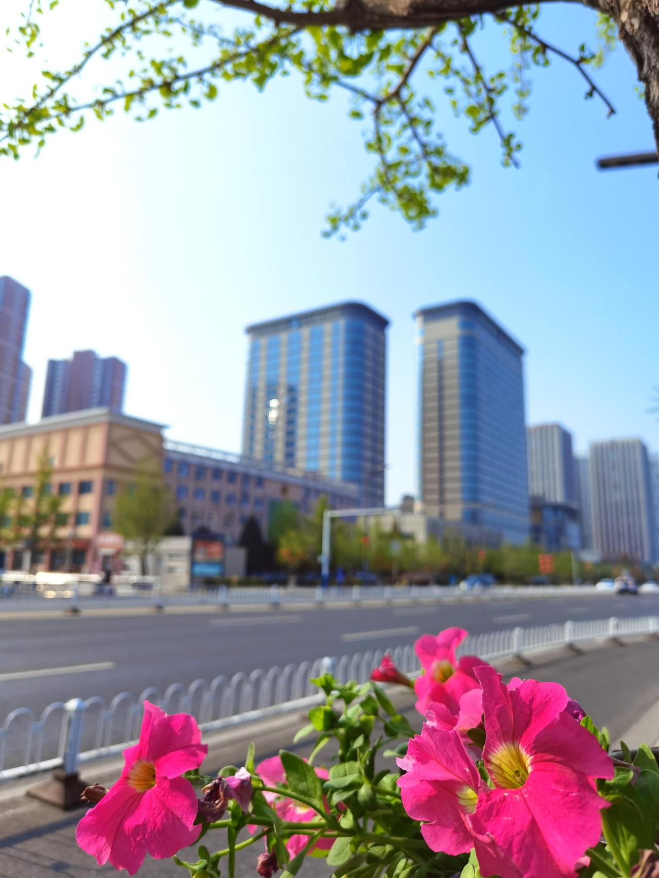 迎宾路两边种满绿植, 四月正是春花盛开的季节, 因此迎宾路瞬间变成了“鲜花大道”。五颜六色的春花和鳞次栉比的高楼,让迎宾路变得分外迷人。
