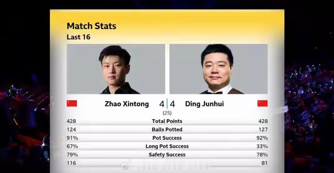简单打了几杆,丁俊晖呲杆了,不光被罚了4分,还给了赵心童自由球。抓住这个机会,赵心童单杆116分赢下比赛,比分来到了2-2平。第五局,丁俊晖右侧中袋红球上手,进攻到11分转为防守。这轮,赵心童拿到了长台进攻的机会,他表演了个一炮双响,一下打进了两颗红球。