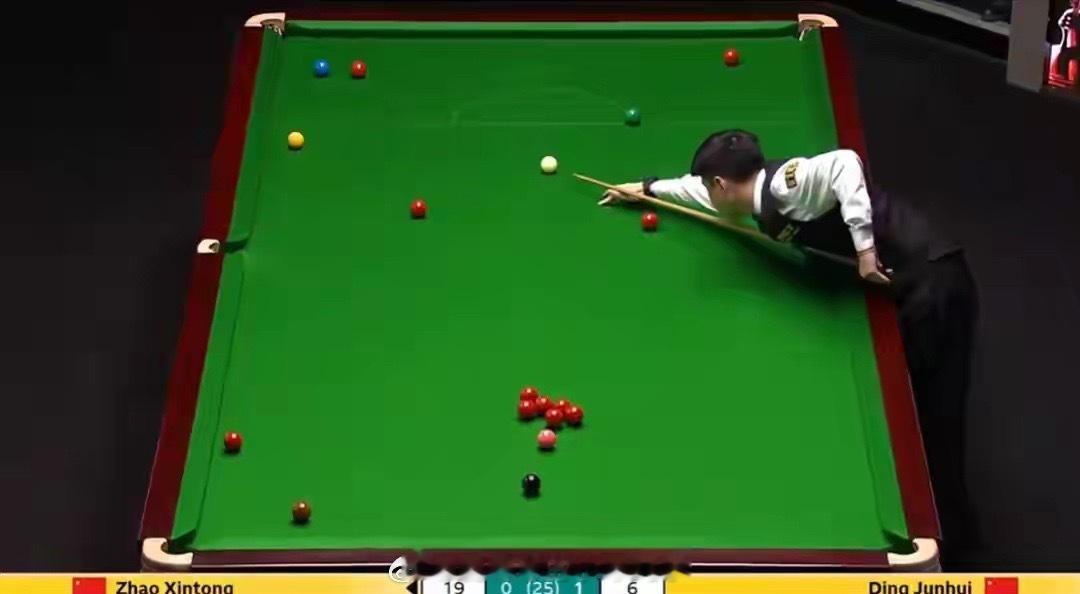 可惜,赵心童红球虽然打进了,但是连接的黑球失误了。这样,丁俊晖左下方底袋红球上手,并且单杆80分赢下比赛,拿到了3-2的领先优势。第六局,赵心童准了一杆右上方顶袋,衔接一颗黑球,顺利进入围球节奏。这杆,打到33分,就没有连接球了,只能转为防守。