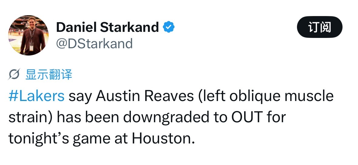 小里不打! 湖人官方宣布:里夫斯因左侧斜肌拉伤,出战状态更新为确定缺席Game3。湖人vs火箭