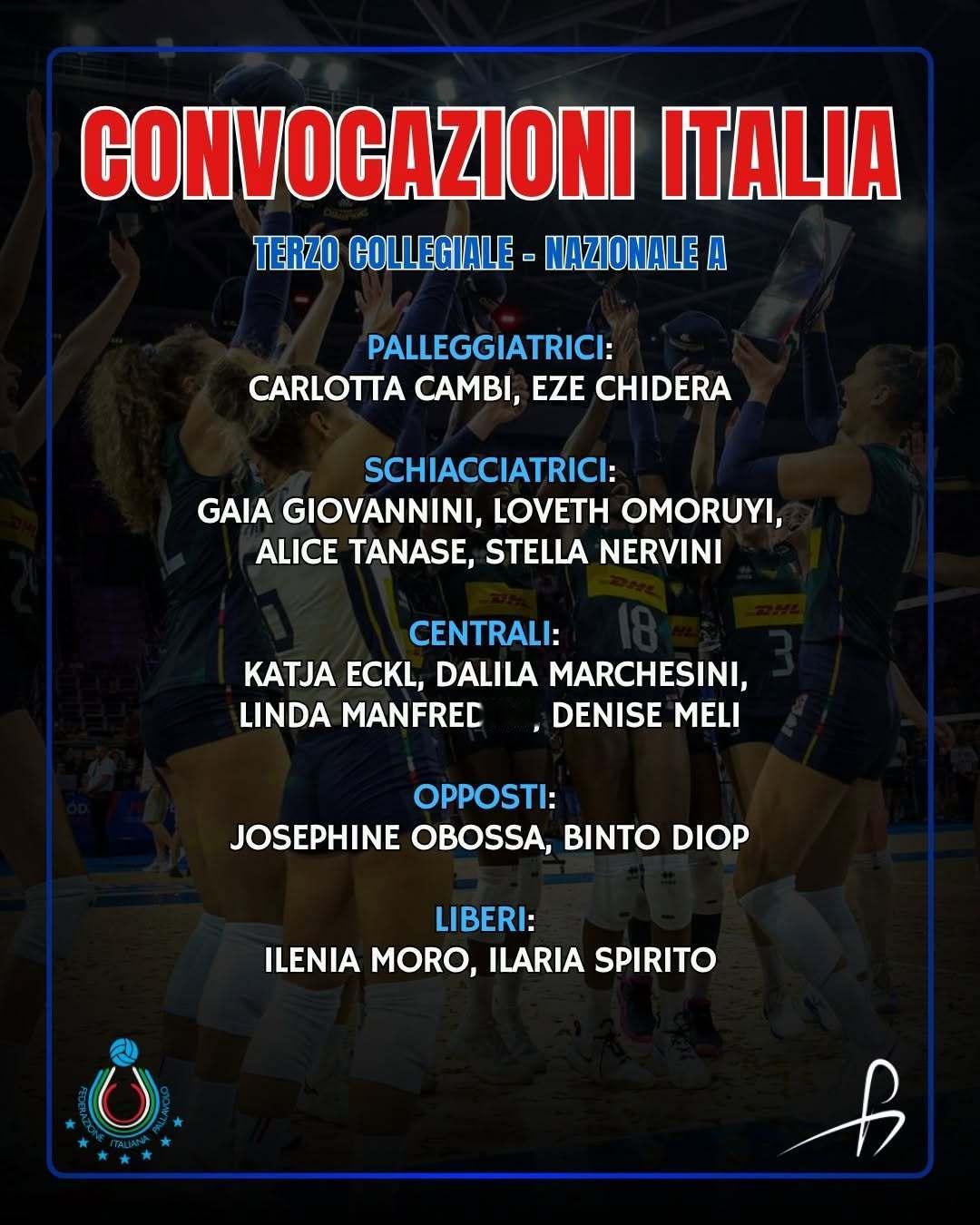 意大利女排国家队公布第三次集训营名单,本次集训将于4月27日-30日在米兰帕韦西中心开展,主帅贝拉斯科聚焦年轻球员,为球队更新换代蓄力。完整名单如下:- 二传:坎比、奇德拉- 主攻:乔瓦尼尼、奥莫鲁伊、塔纳塞、内尔维尼- 副攻:埃克尔、马尔切西尼、曼弗雷迪尼、梅利- 接应:奥博萨、迪奥普- 自由人:莫罗、斯皮里托本次集训以考察和锻炼新人为主,多位意甲表现亮眼的年轻球员入选,她们将在训练中打磨技术、磨合战术,竞争后续国际赛事的参赛资格,成为意大利女排未来的中坚力量。