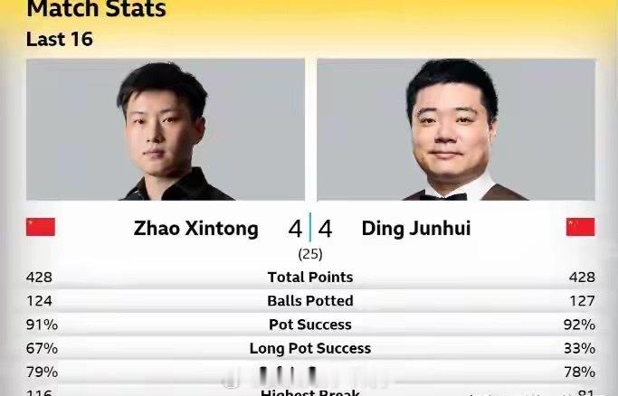 二、中国德比平分秋色,丁赵大战悬念拉满备受瞩目的丁俊晖与赵心童的中国德比,首阶段8局战罢双方打成4-4平。比赛中,两人均展现出顶级进攻水准,丁俊晖打出两杆50+,赵心童则以精准长台屡屡制造机会,双方你来我往,互不相让。这场对决是两位中国斯诺克核心球员在世锦赛的首次交锋,首阶段的平分秋色也让后续第二阶段的争夺充满悬念,谁能率先发力,谁就将掌握晋级主动权。克鲁斯堡魔咒影响,赵心童还真可能被丁俊晖淘汰!