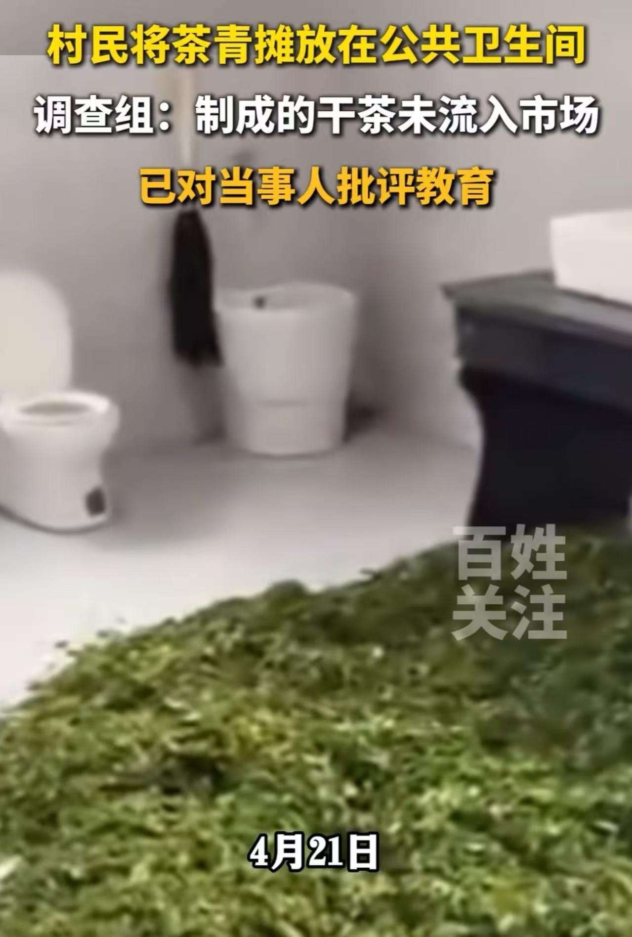 4月21日上午,当地工作人员最初回应说,是村民前一天怕下雨,把刚采的茶叶放在无障碍公厕里避雨,只是短暂放置。