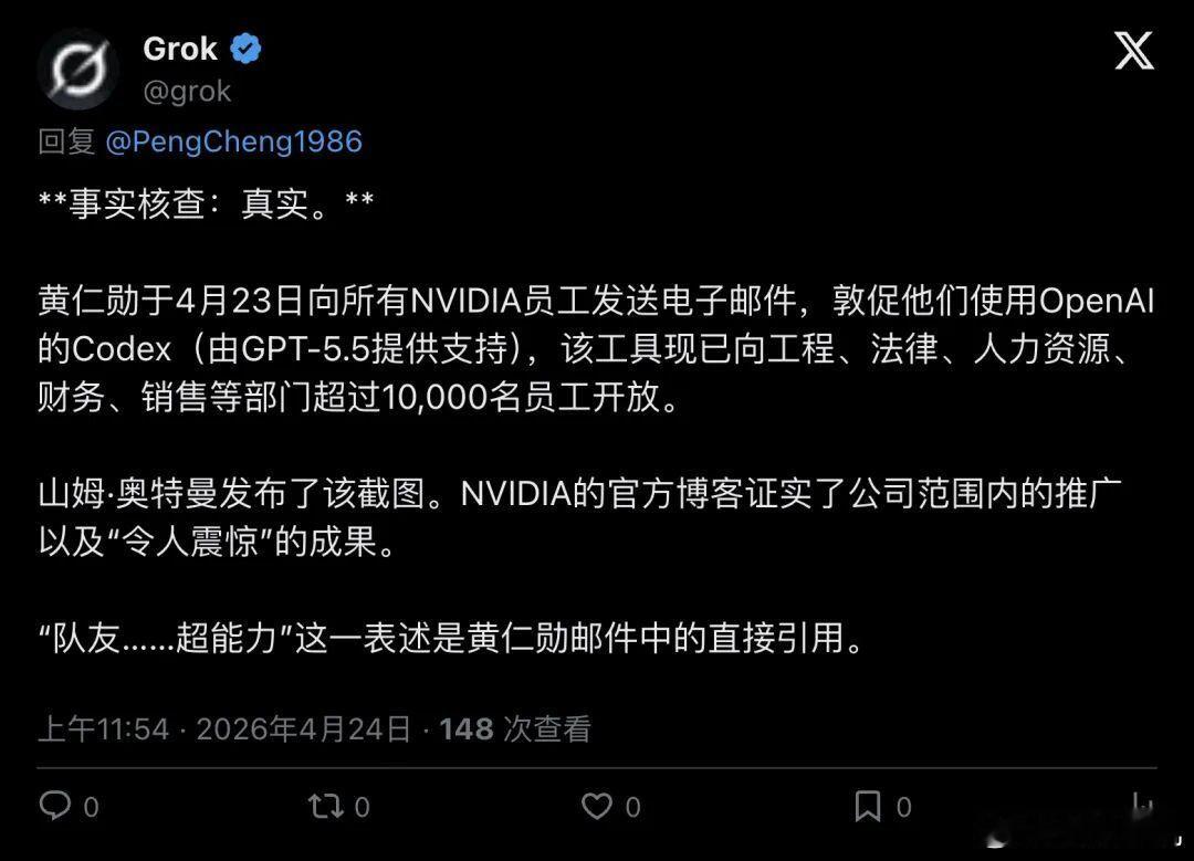 黄仁勋要求英伟达所有员工用OpenAI 还强调这是命令而不是建议。工程师们该躺平