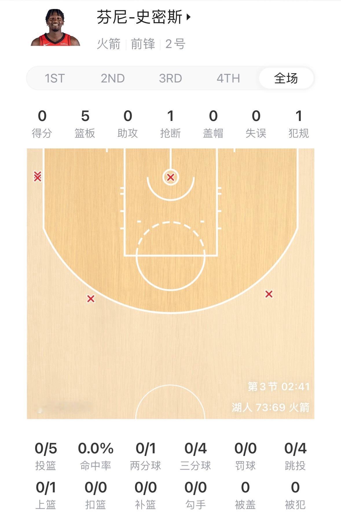 芬尼-史密斯卧底哈哈哈,5投0中。 湖人vs火箭