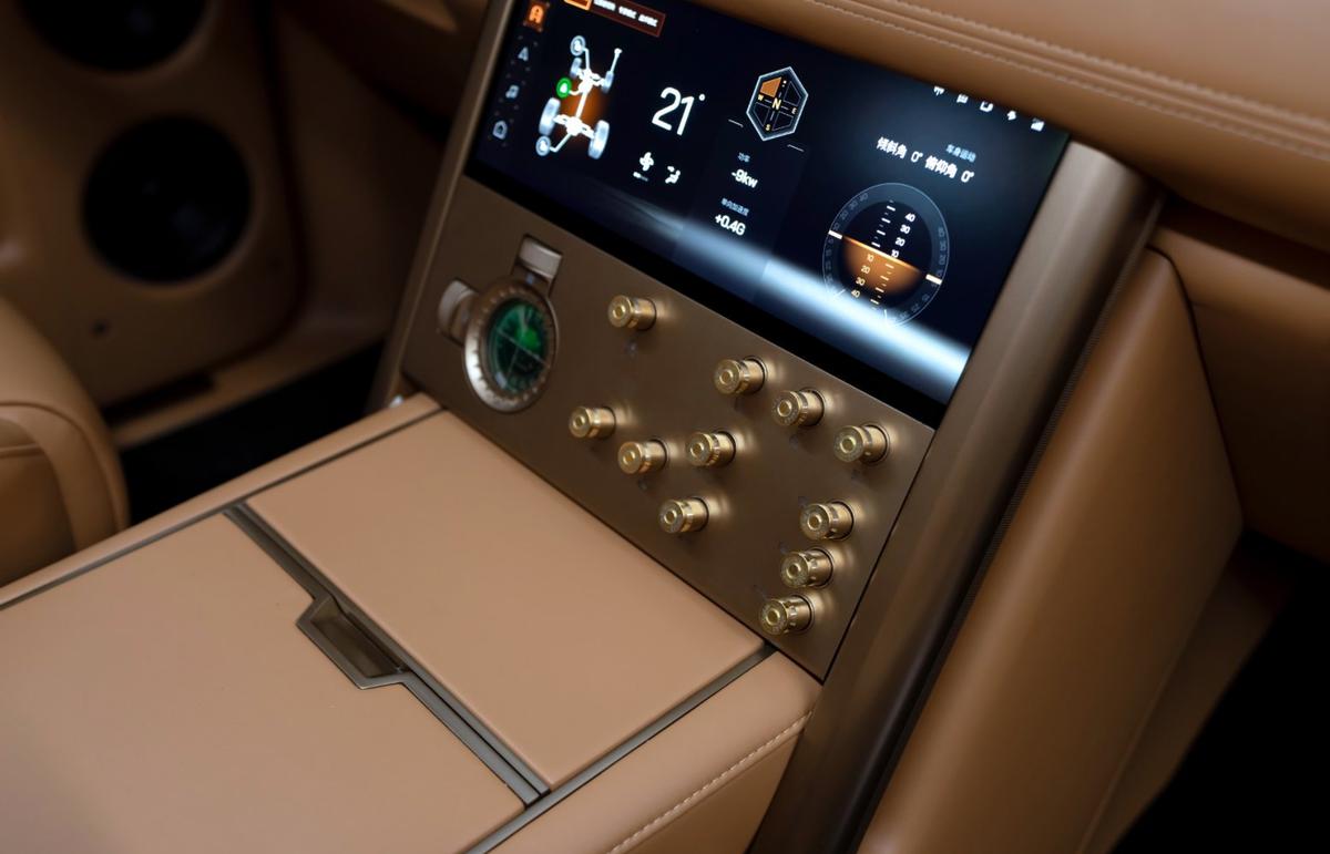 而且新车的底盘是标准的非承载式车身,三把锁配双电机四驱,305mm宽胎、前六后四活塞刹车,越野硬指标一个没落下。