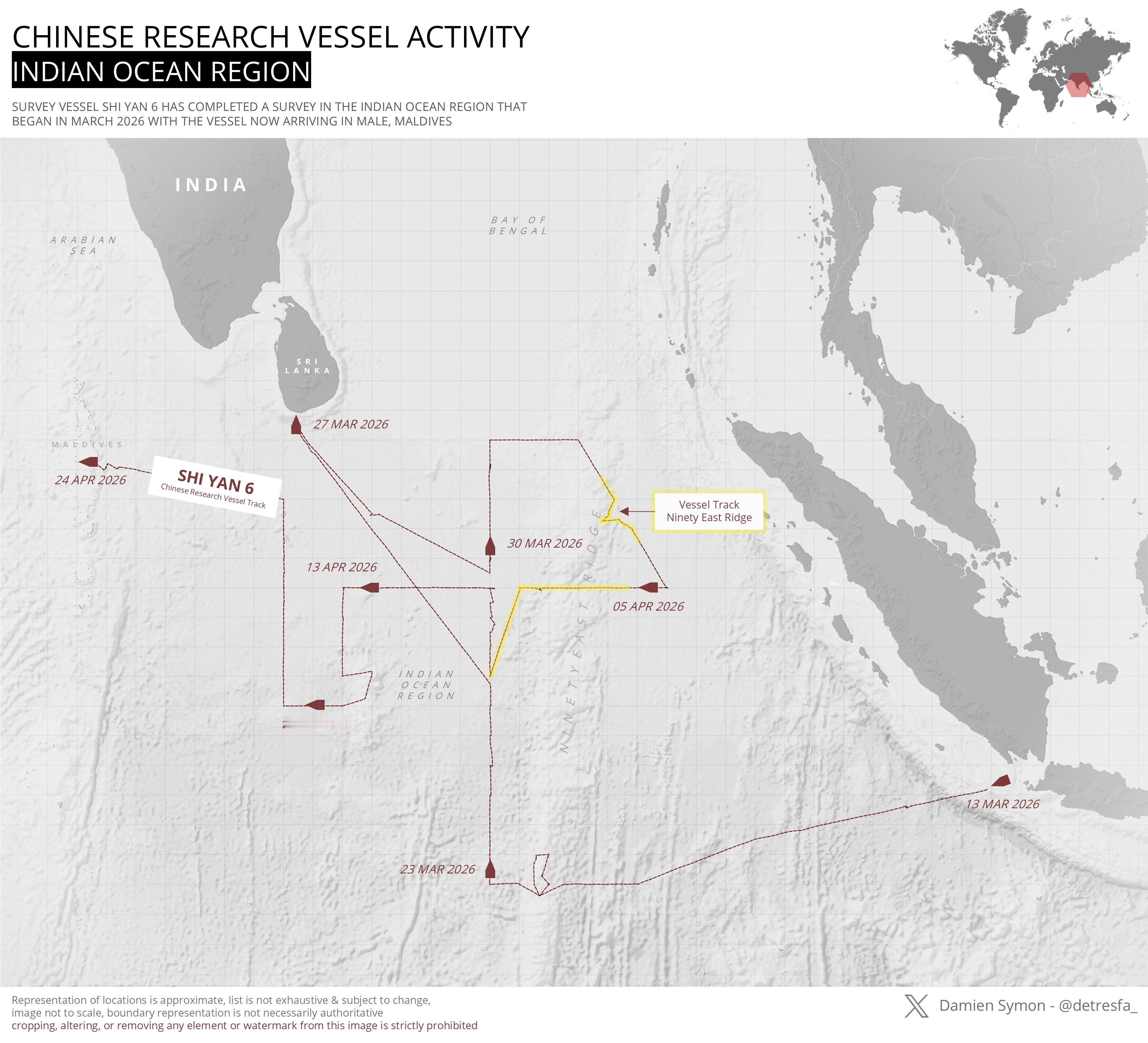 外网的开源观察者称实验6号科考船再次进入印度洋。国内报道2026年2月该船刚回广州,结束了为期92天的印度洋科考,3月又进入印度洋科考了?该船2020年交付,排水量3999吨,具备0-11000米综合环境探测能力,海底地形地貌高精度全覆盖测量能力,水深11000米海底极端环境现场观测和保真取样能力,遥感信息现场印证能力。