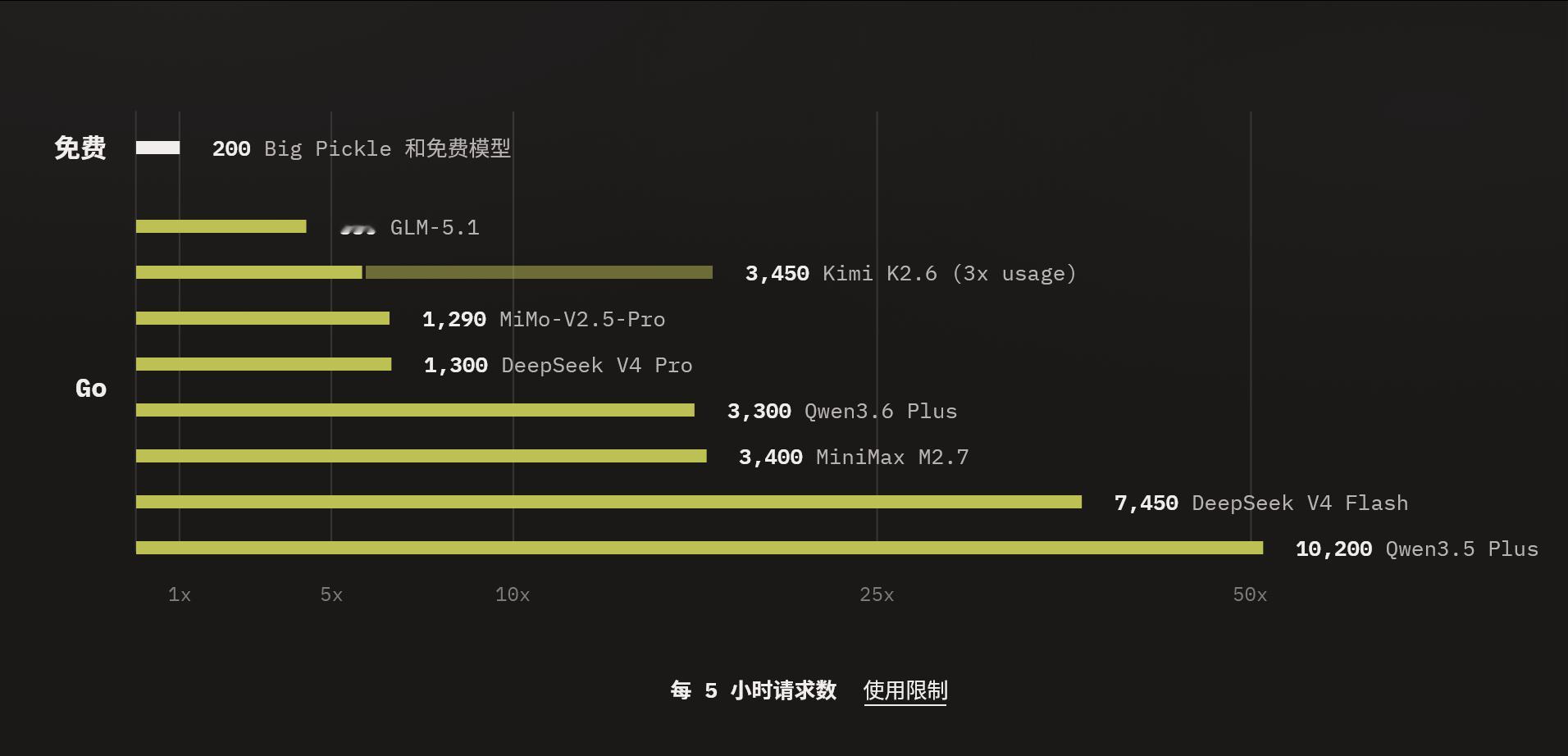 DeepSeekV4上线OpenCode的Go套餐每5小时可以使用1300次请求