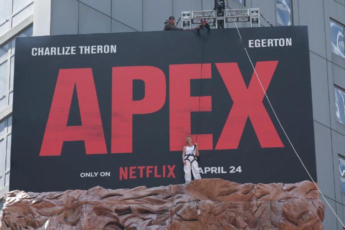 查理兹塞隆攀岩宣传新片 查理兹·塞隆现身纽约时代广场,现场攀岩,为自己的新片《巅峰猎杀》造势,哇第一次见这样的宣传!