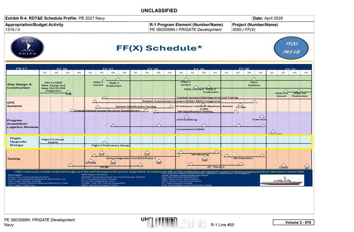 烽火问鼎计划 FF (X) 护卫舰的采购计划为:2027 财年采购 1 艘,2029 财年采购 1 艘,2031 财年采购 2 艘,最终总采购量为 22 艘。其中,Flight I 批次 “至少” 包含前 2 艘舰;Flight II 批次的初步设计工作预计将于 2027 财年启动,该批次将重点考虑集成垂直发射系统(VLS)与反潜战(ASW)能力。